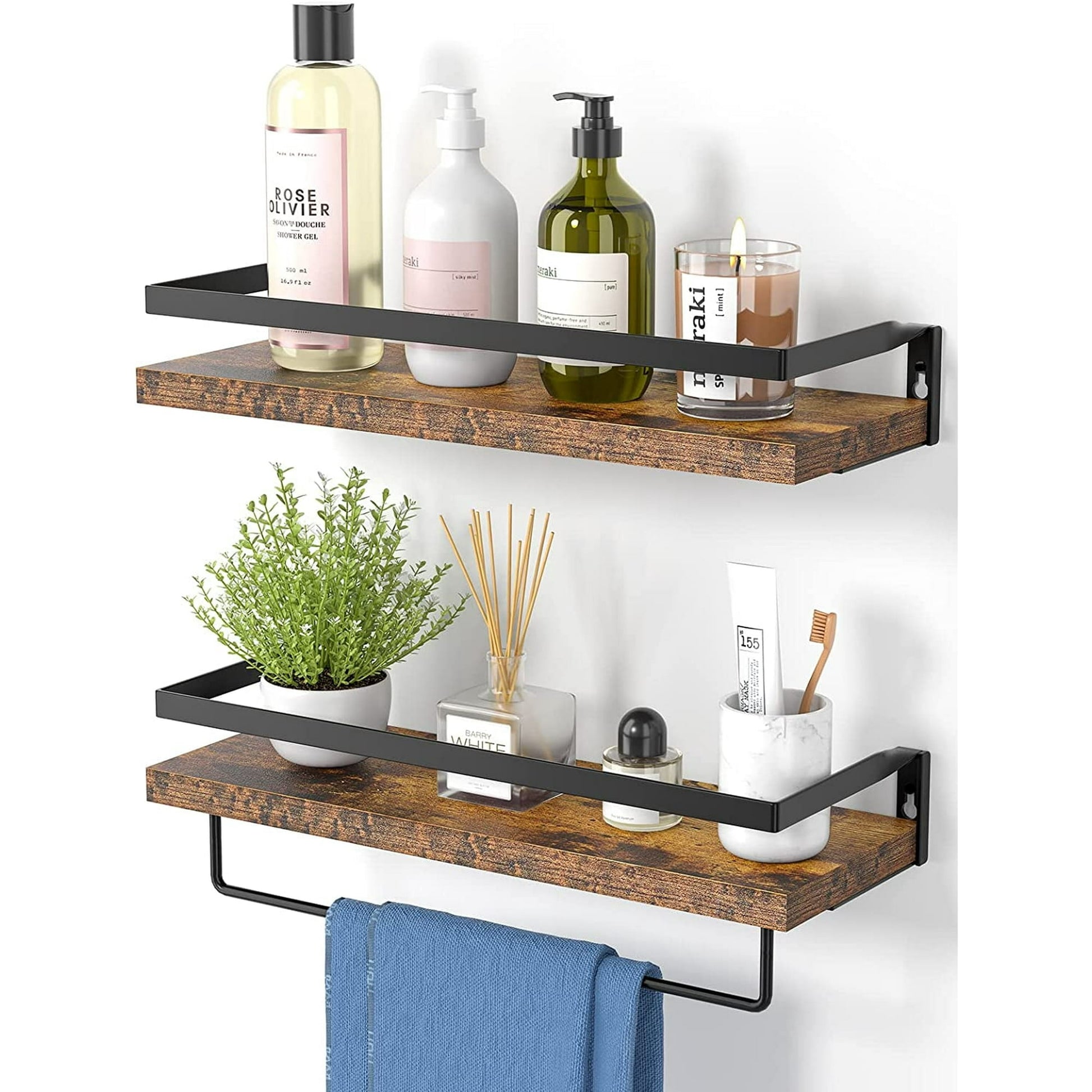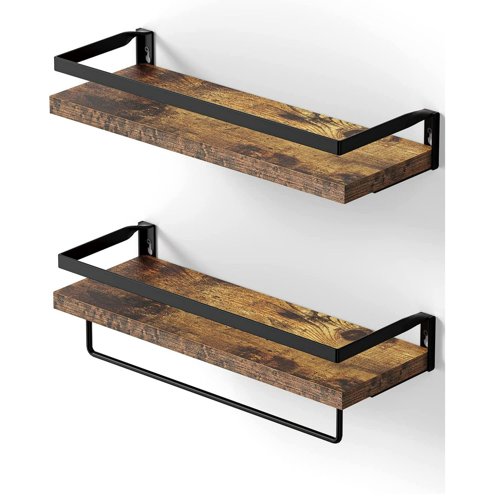 2 Pack Wall Mounted Wood Rustic Floating Shelves, Storage Shelves with Towel Bar for Bathroom, Kitchen, Bedroom, Living Room