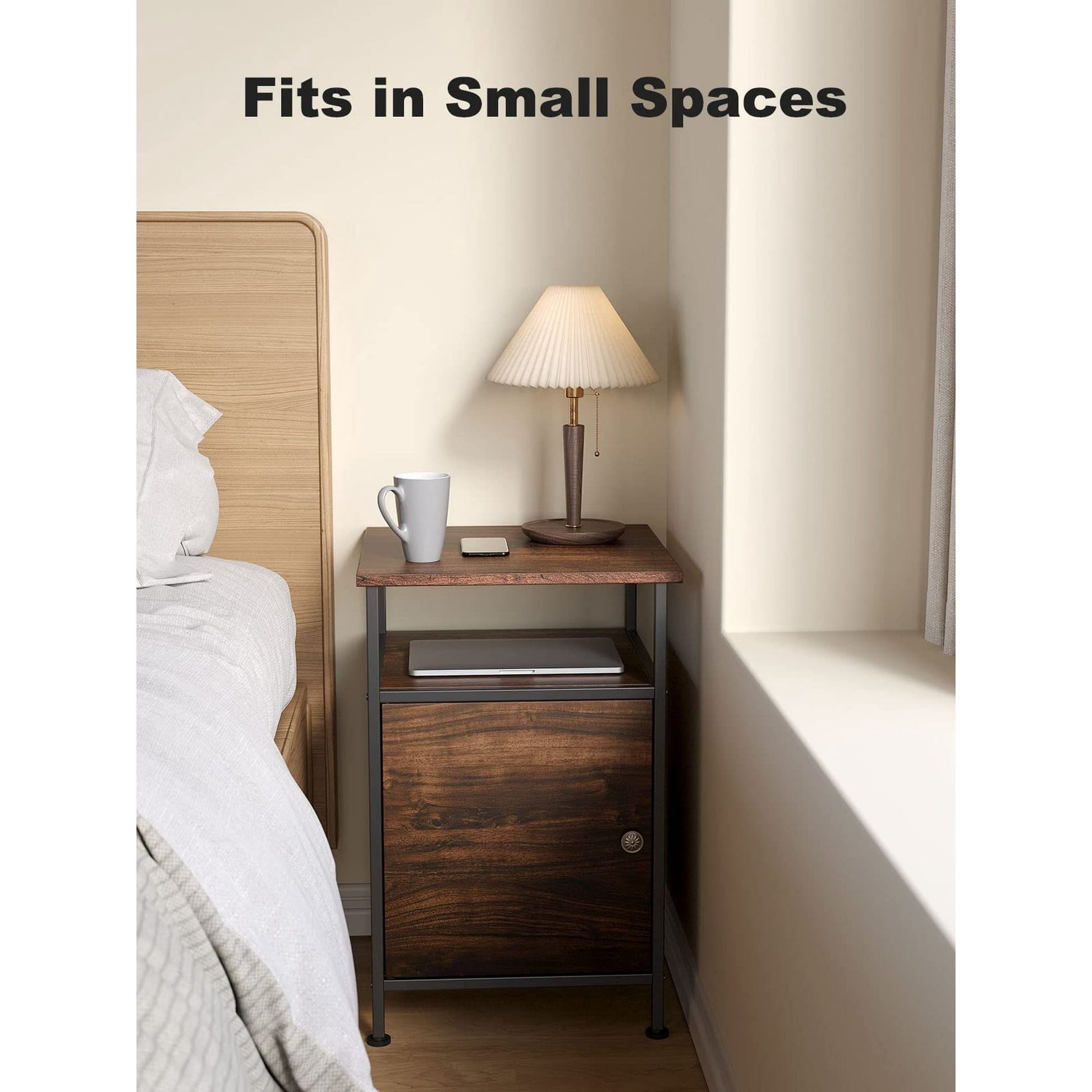 The compact design of the storage side table fits well in small spaces. Put this storage end table beside your sofa or bed .