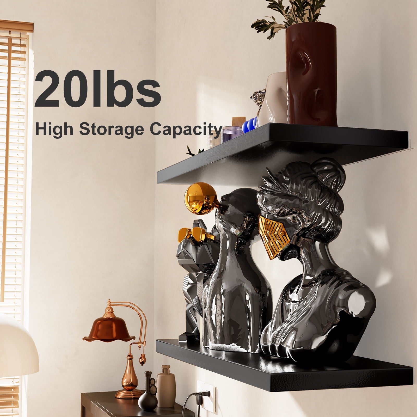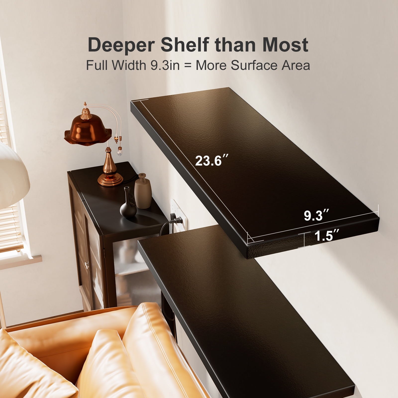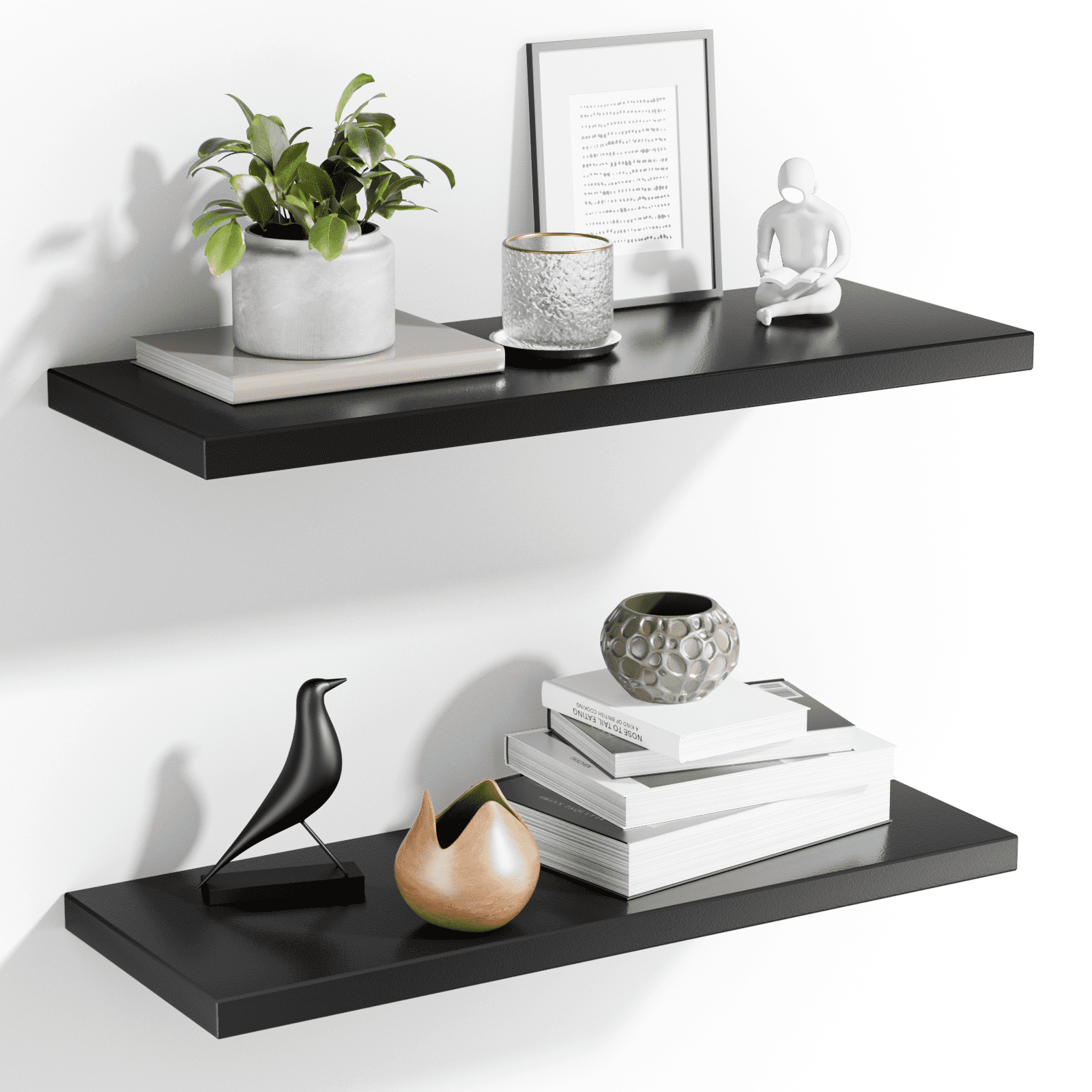 - Free up more Space: made of beautiful mdf wood with a matte black finish, each board measures 23.6” l x 9.3” w x 1.5” h. easily make your studio apartment, dorm, or small living quarters feel larger by adding floating shelves for decoration or storage.