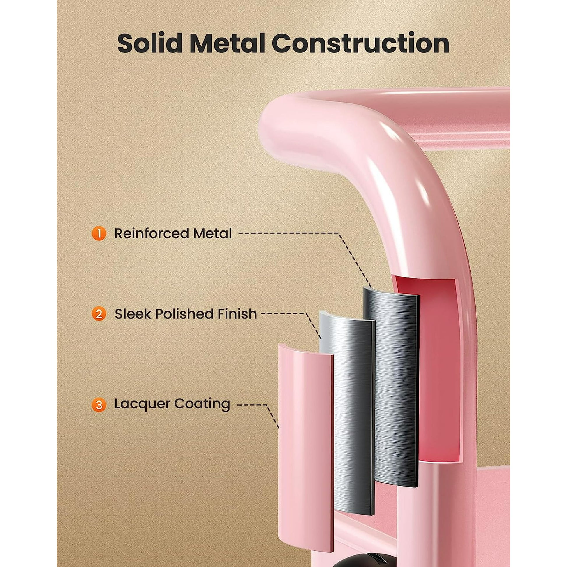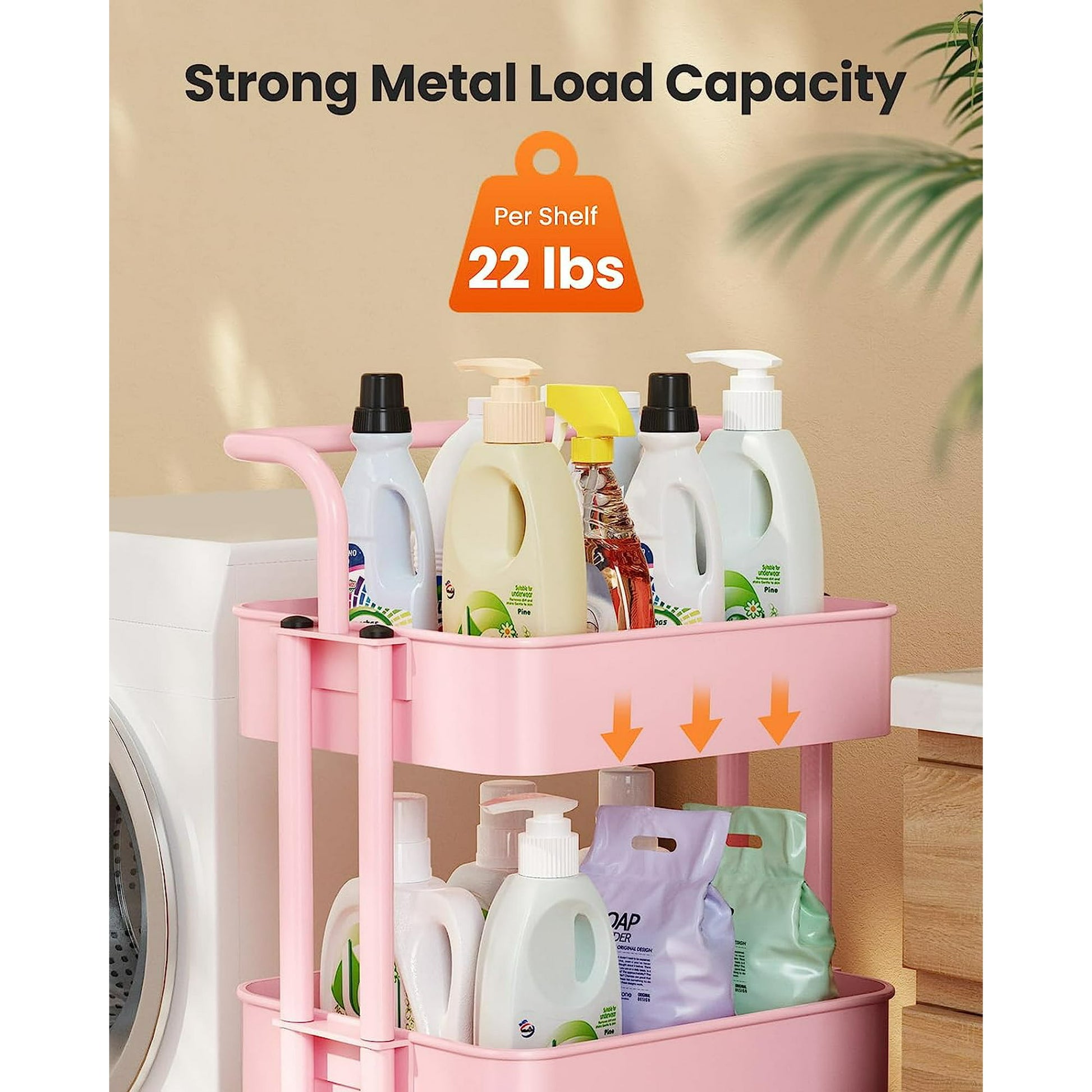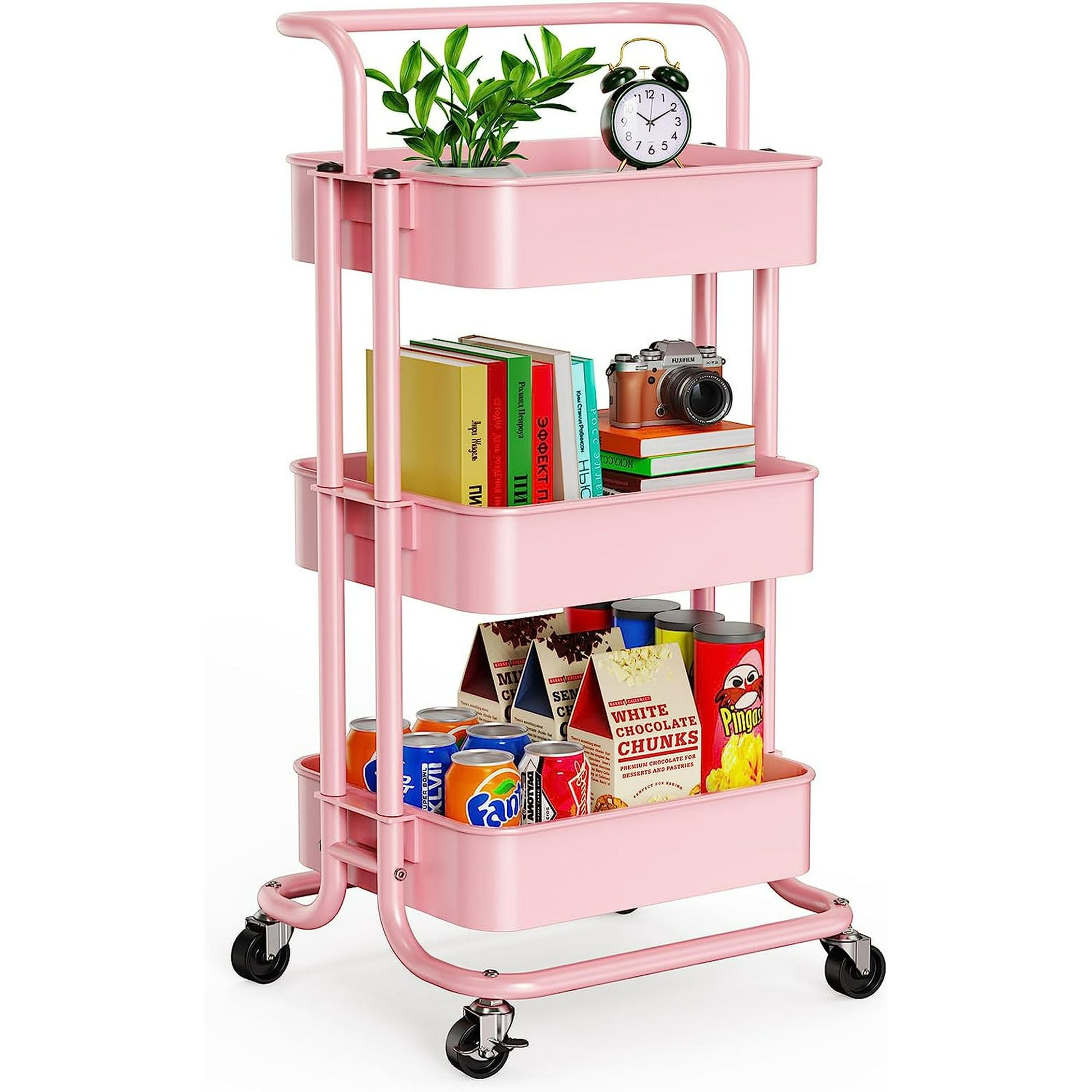 3-Tier Metal Rolling Cart Utility Cart Storage Cart with Lockable Wheels for Kitchen Bathroom Office(Pink)