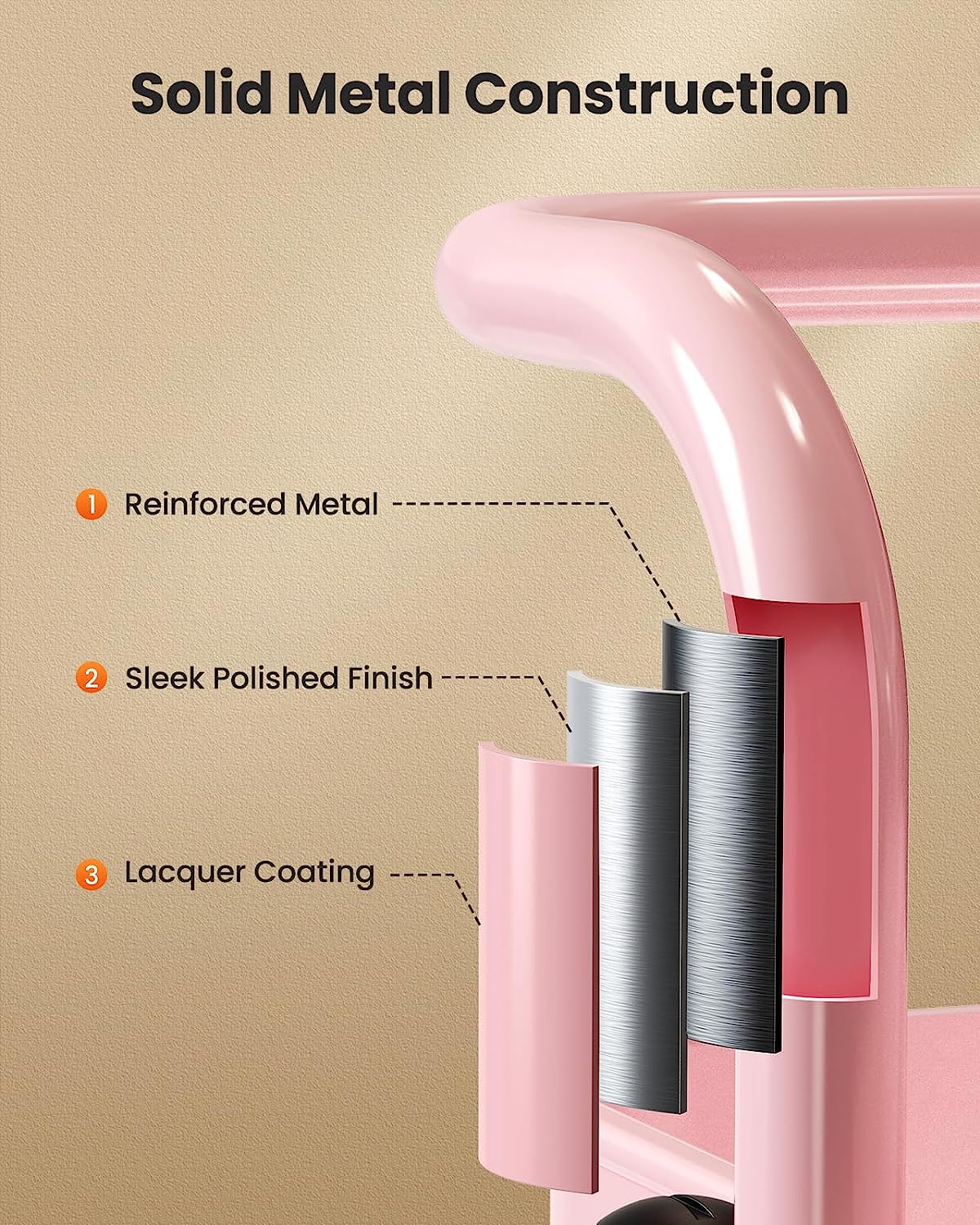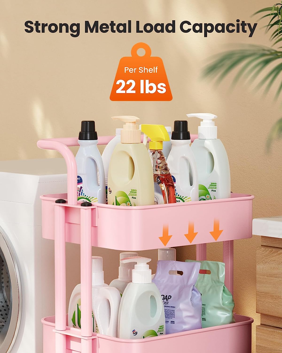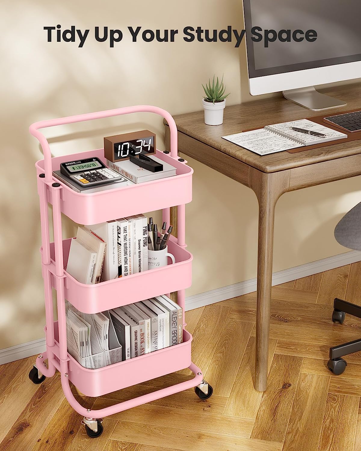3-Tier Metal Rolling Cart Utility Cart Storage Cart with Lockable Wheels for Kitchen Bathroom Office(Pink)