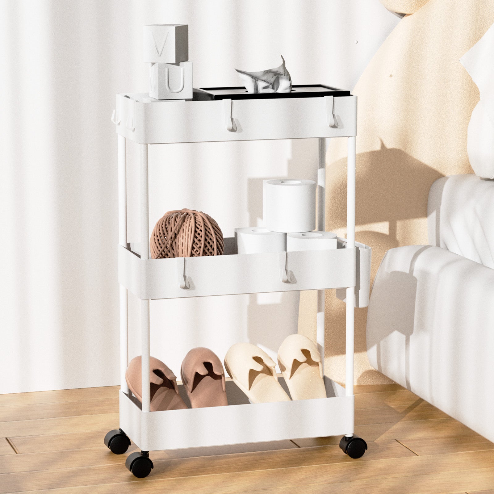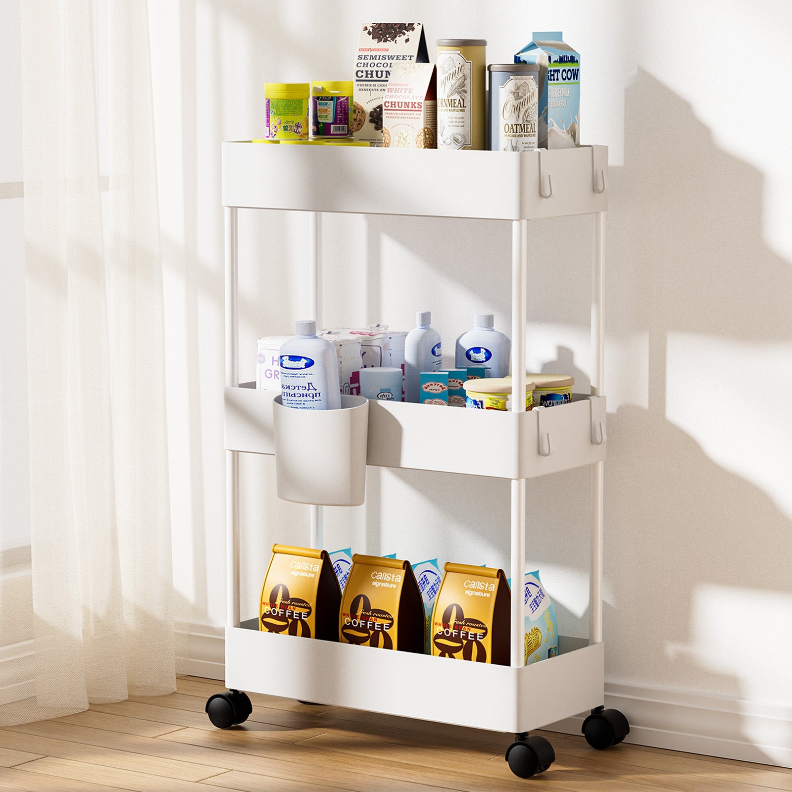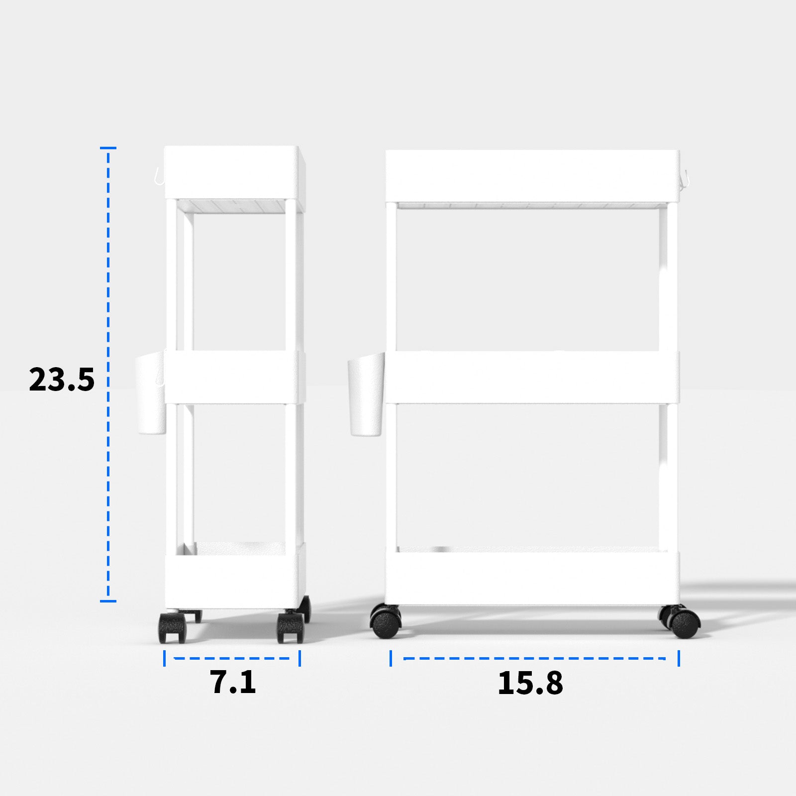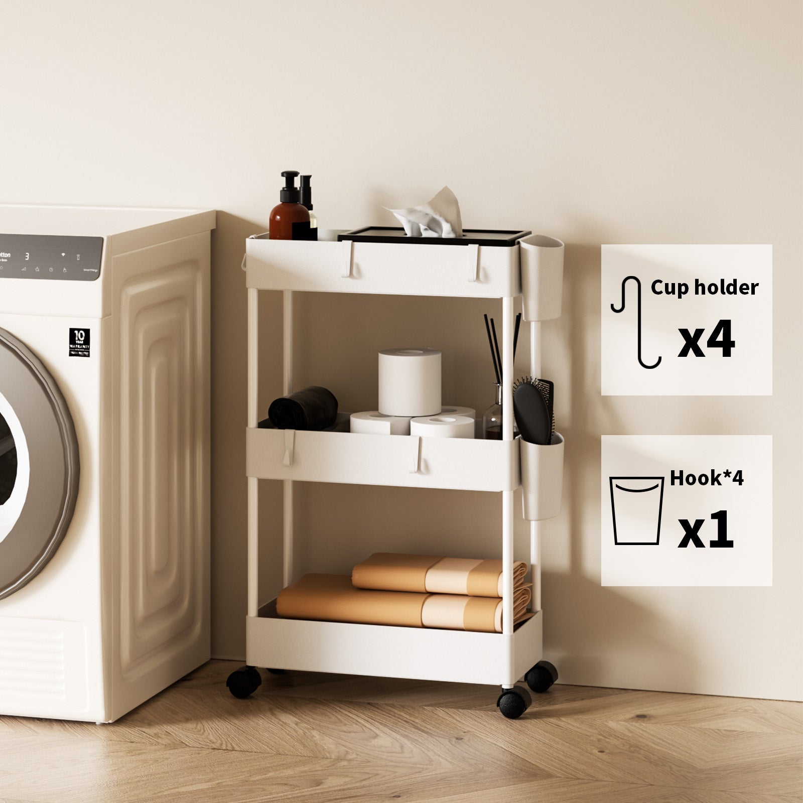 - The storage cart includes 2 cups and 4 hooks to hang on the side of storage cart for quick access. This bathroom cart rolling cart also works well in the closet, kitchen, garage, laundry room, the office, and more.
