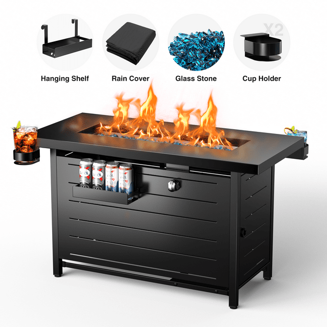 43" Propane Fire Pits for Outside 60,000 BTU Gas Fire Pit Table for Outside with Lid , Glass Beads, Cup Holders, Hanging Shelf & Nylon Cover, Rectangle