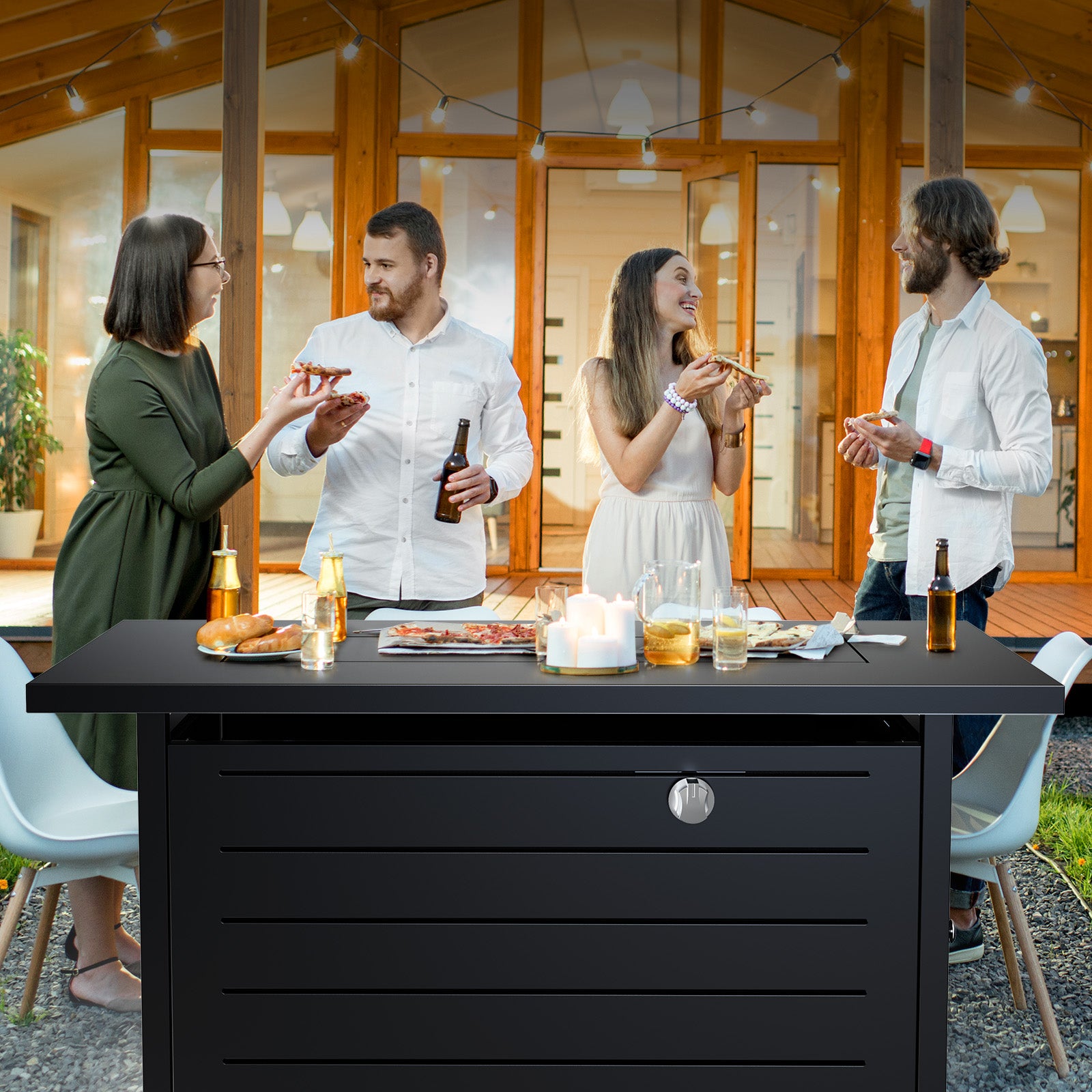 - 2 in 1 Outdoor Gas Fire Pit Table:Cover the lid, it can be easily converted into a outdoor dining table, bar table, coffee table. easily by covering the lid provided when not burning. The natural slate tabletop is easy to clean and offers strength and durability throughout the season.