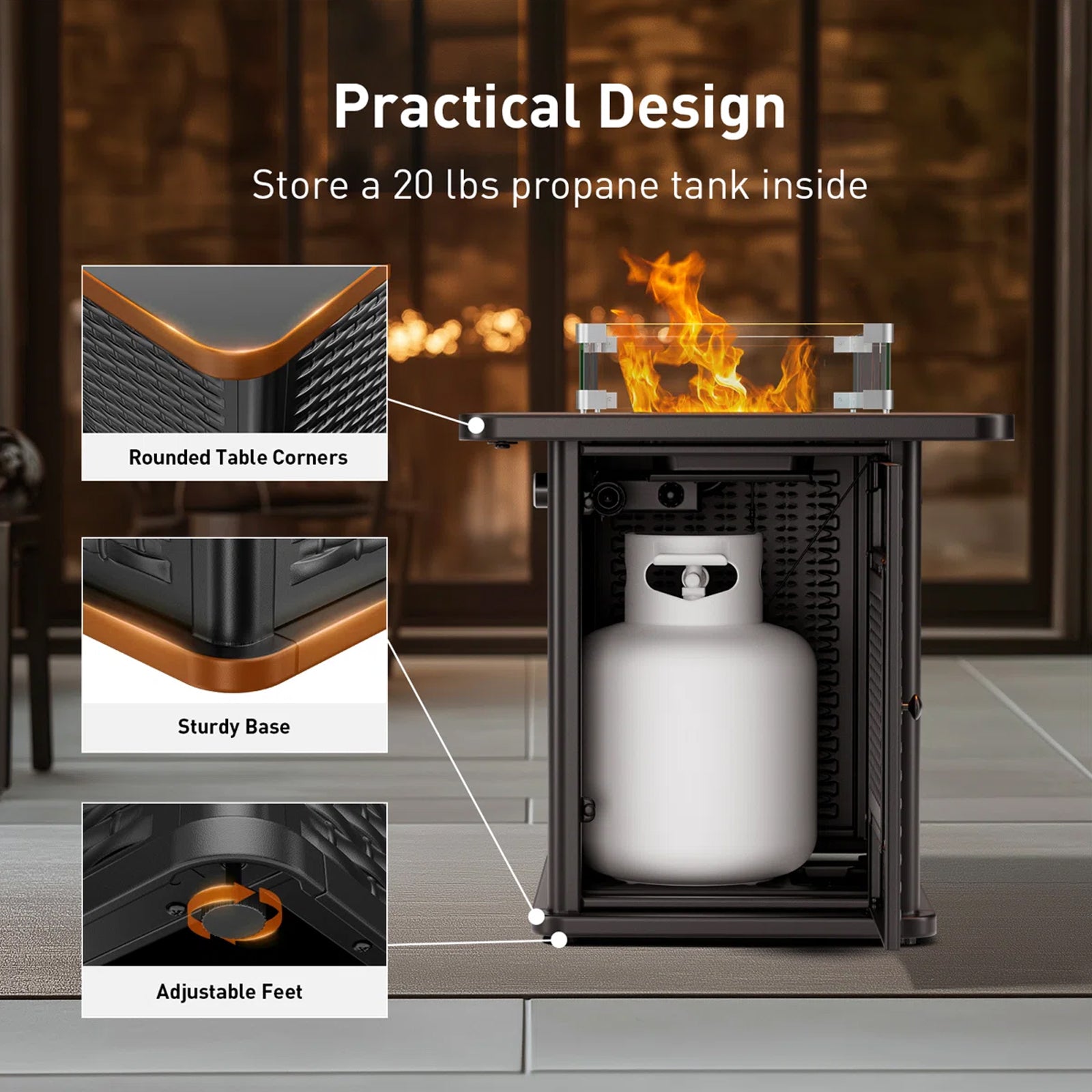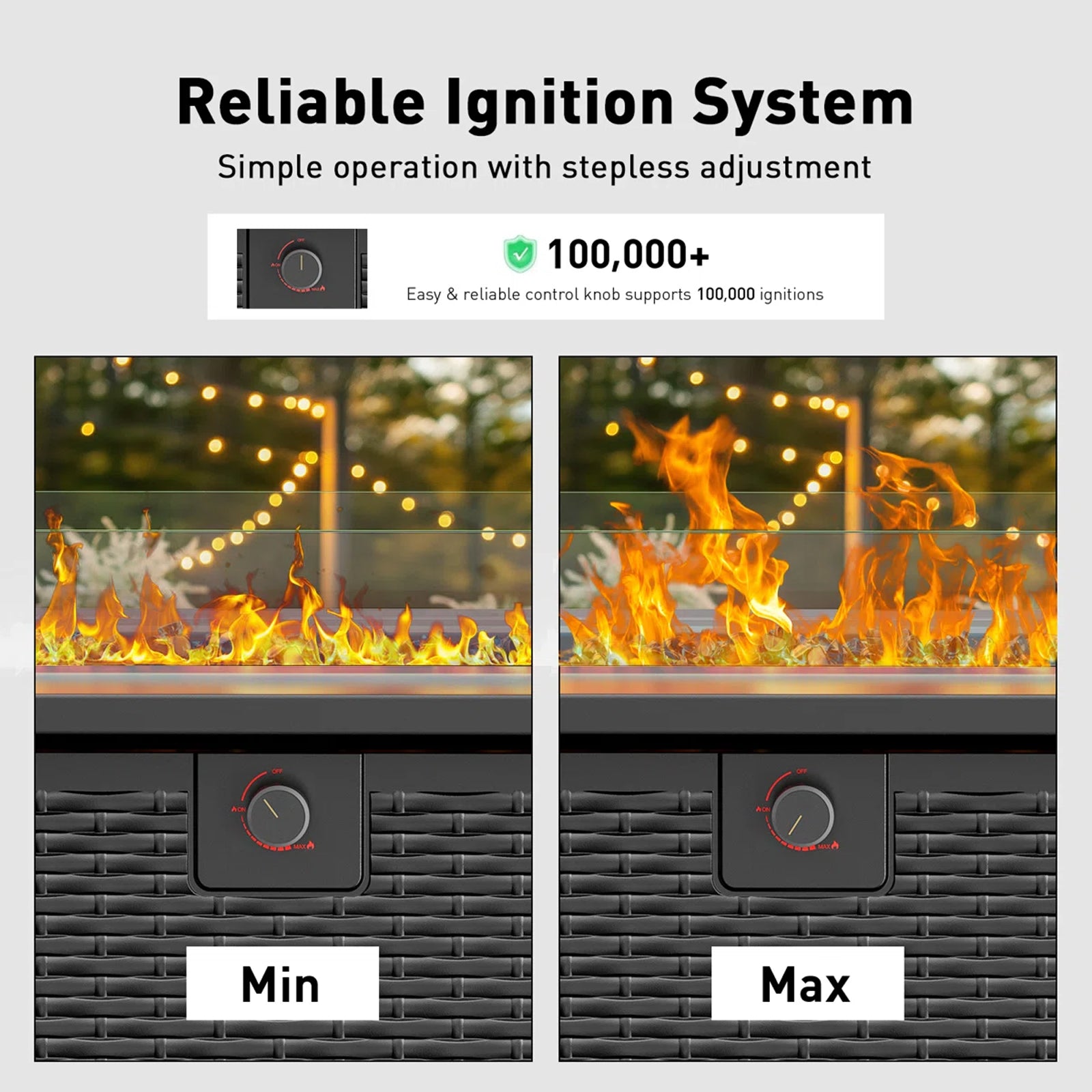 - 【All-Weather Performance with Wind Guard】Enjoy steady, wind-resistant flames thanks to the included tempered glass wind guard, designed to protect the fire from gusts while adding a sleek modern look. The powder-coated steel frame and PE wicker panels resist rust, fading, and weather damage—perfect for year-round outdoor use.