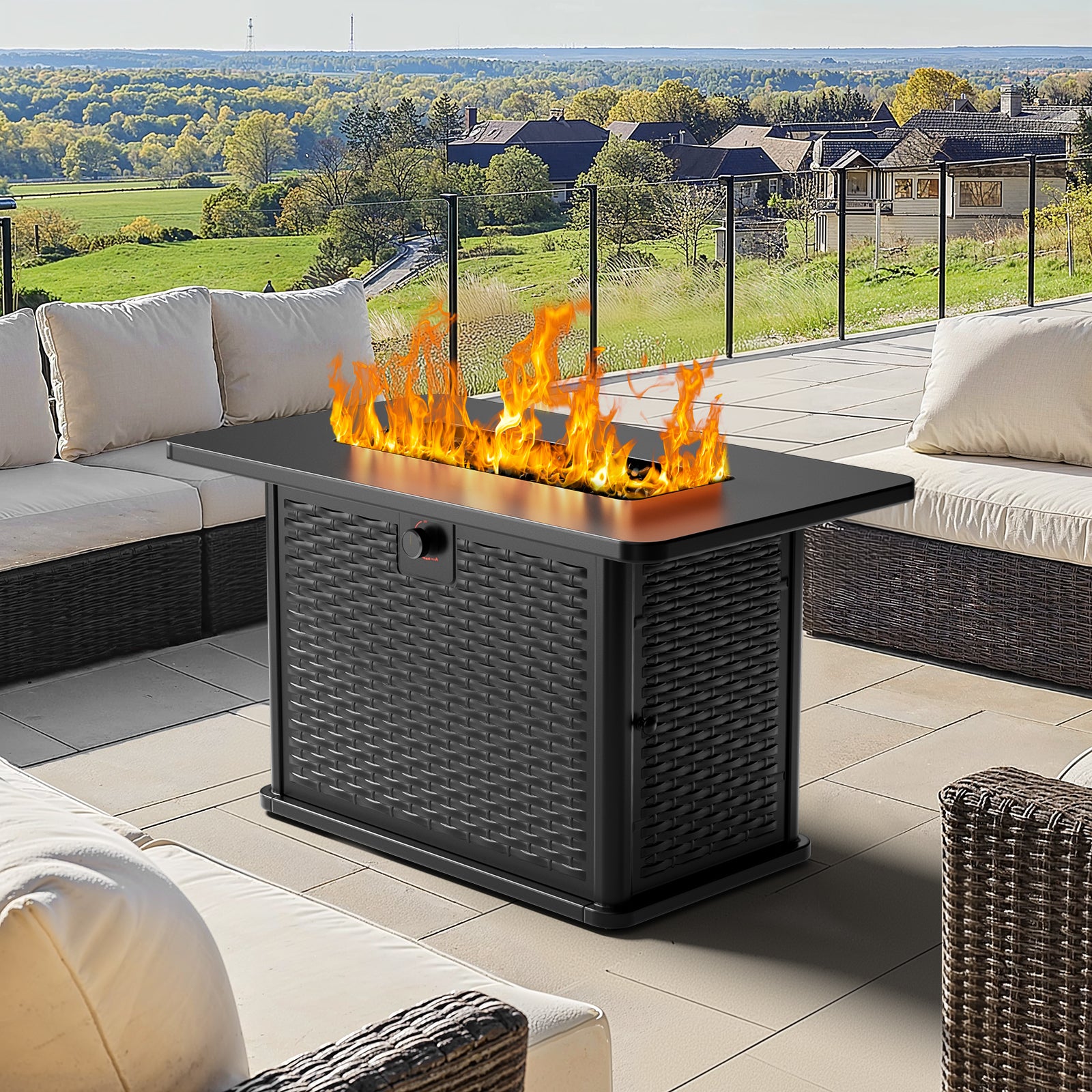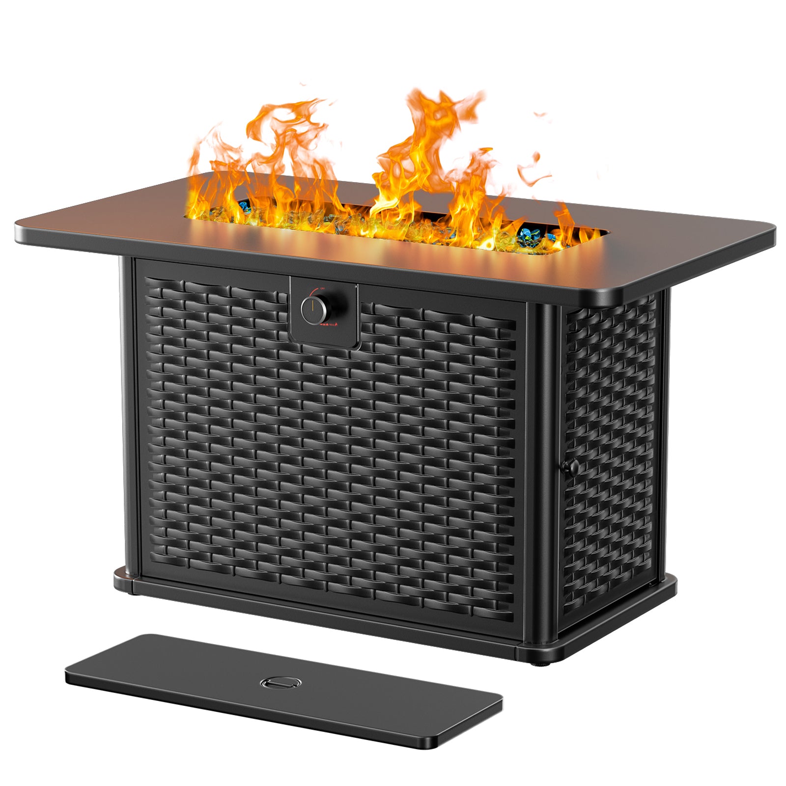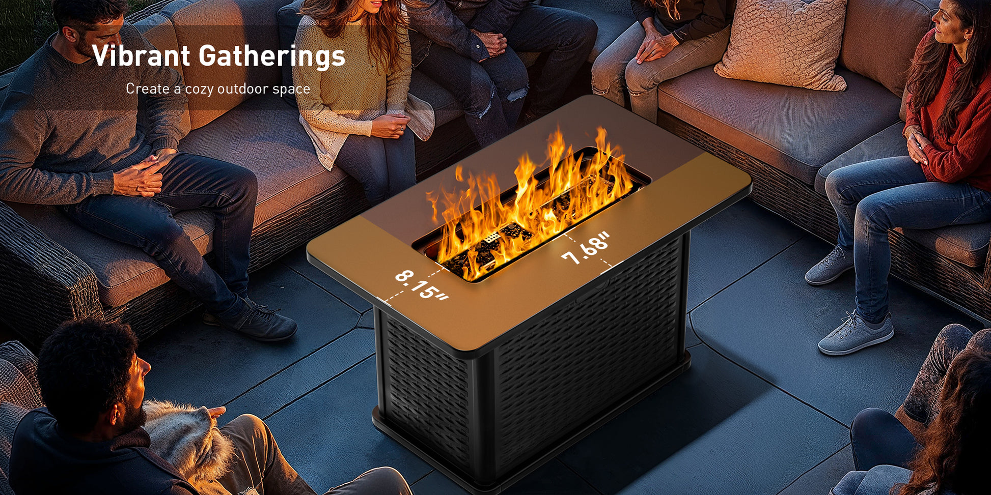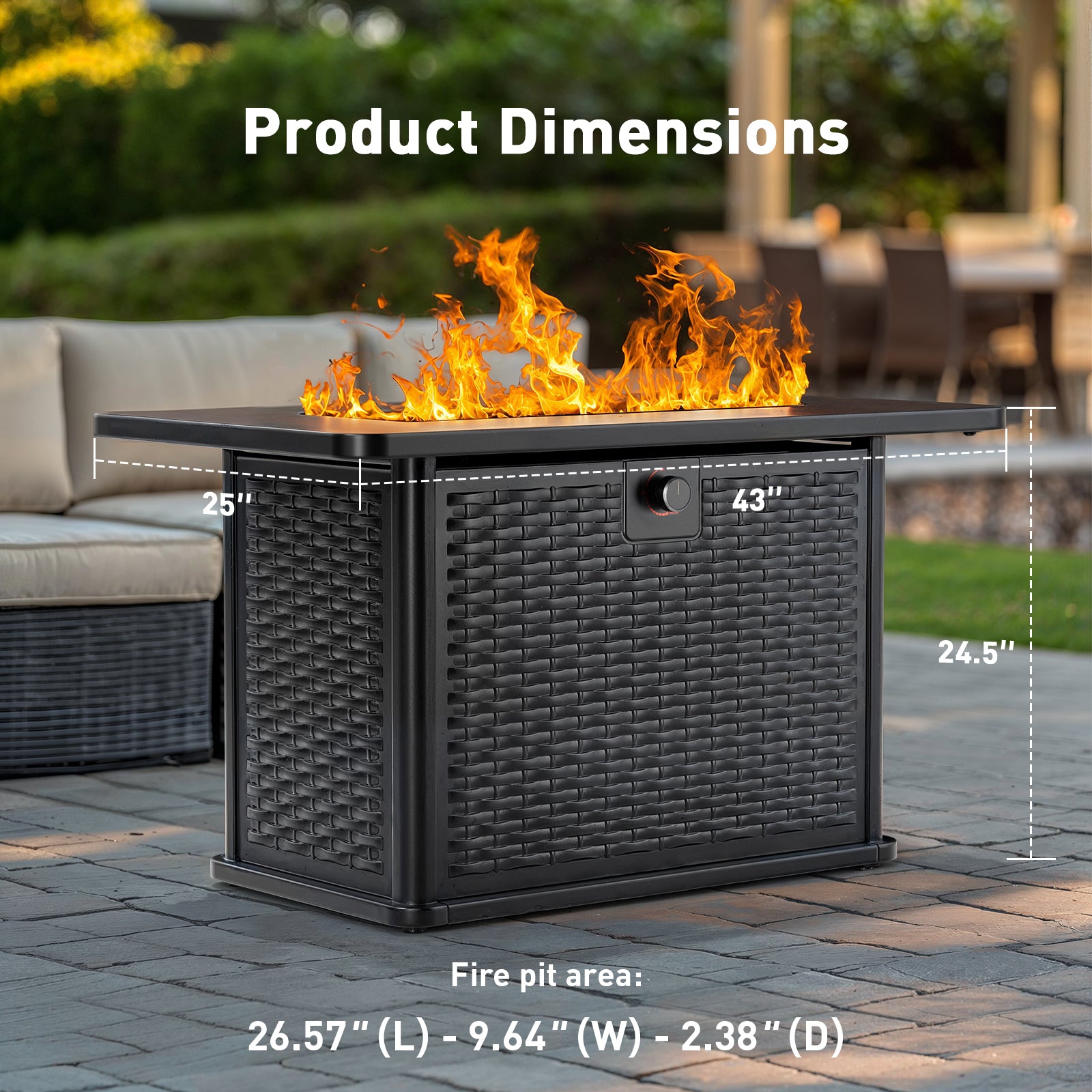 Upgrade your outdoor living space with our 43" Rectangular Propane Gas Fire Pit Table, designed for both warmth and style. Crafted with a durable black steel frame and tempered glass rocks, this fire pit table provides a modern touch to your patio, garden, or backyard. The included waterproof cover ensures long-lasting protection against weather elements, while the sleek rectangular design complements any outdoor decor. Perfect for entertaining guests or cozy family nights, this fire pit table runs on propane (tank not included) and features an easy-to-use ignition system. Enjoy the ambiance of flickering flames without the hassle of wood or cleanup—just turn it on and relax!