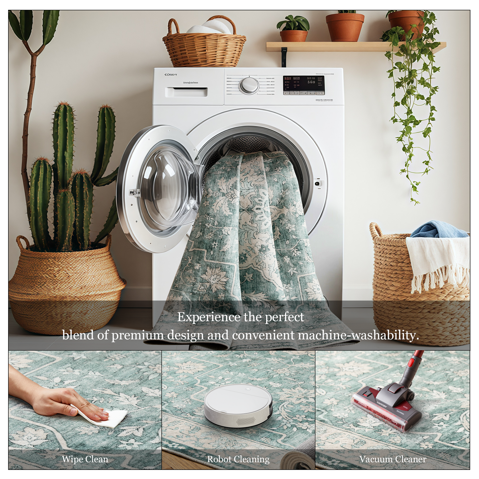 【Easy Care】With its machine-washable feature, this area rug is incredibly easy to clean and maintain. Simply toss it in the washer, and it’ll look as good as new—every time. For daily care, a swift sweep or wipe suffices. Perfect for busy households, pet owners, or anyone who values convenience.