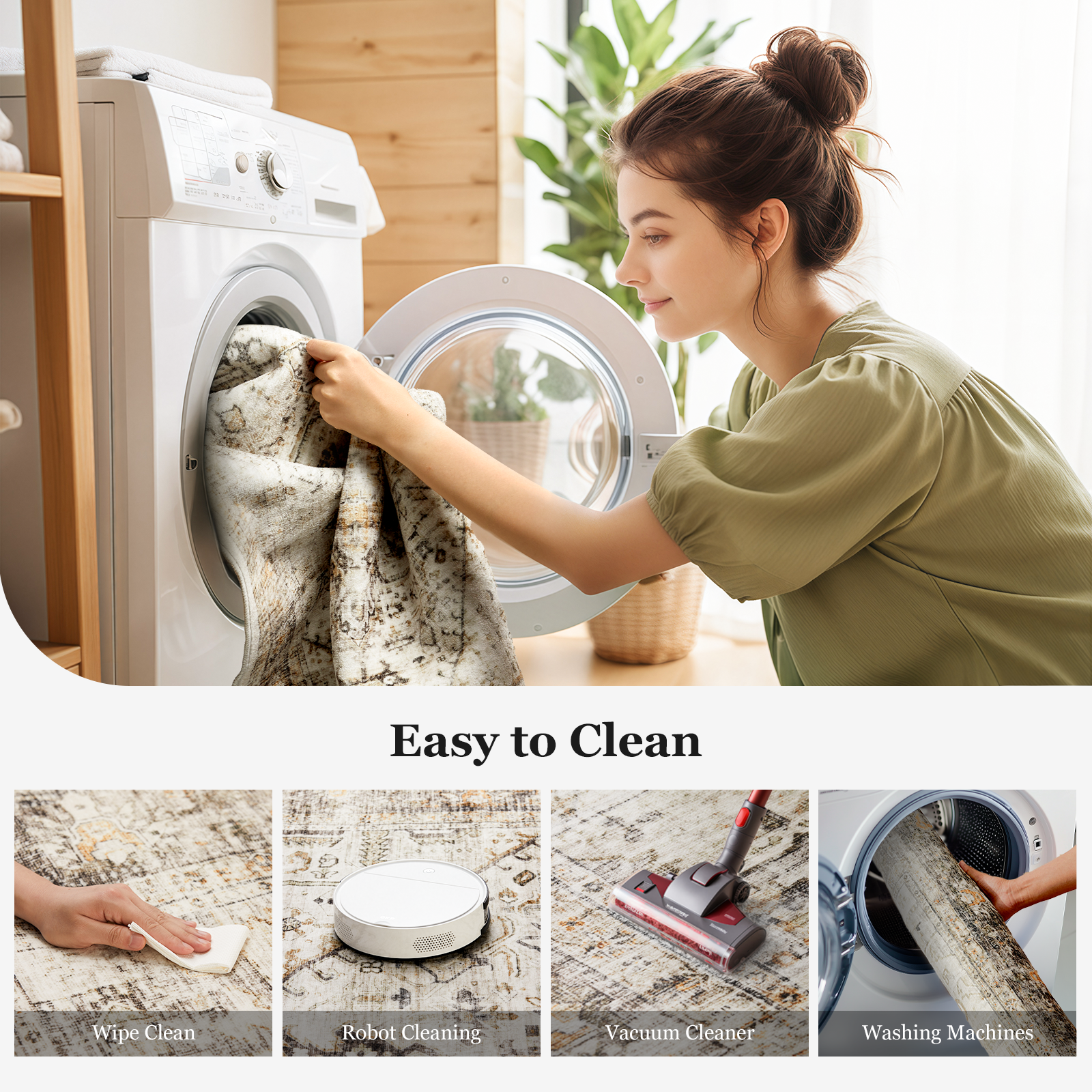 - Easy to Care: For daily care, a swift sweep or wipe suffices. When vacuuming, use a low-speed setting or a robotic vacuum to prevent the rug from moving or bunching up due to its soft, flexible backing. For deeper cleaning, machine wash with cold water, avoiding bleach to maintain its colors