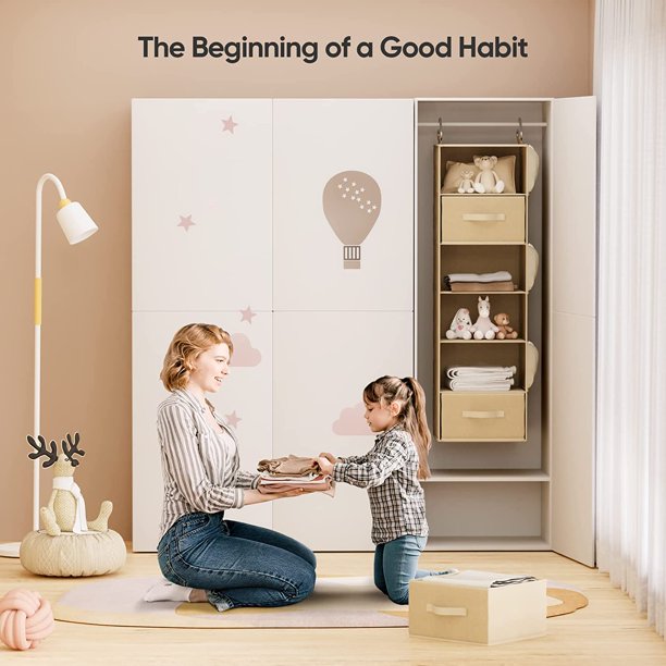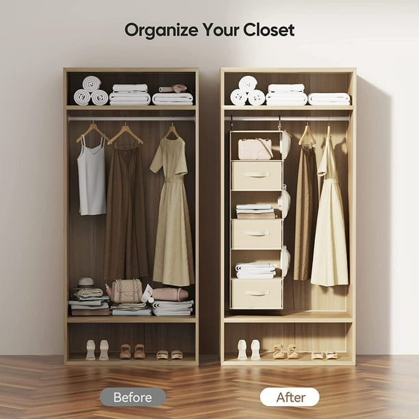 - PRACTICAL CLOSET ORGANIZER: Our hanging closet organizer with drawers uses the vertical space in your closet to maximize capacity. The contemporary fabric and stylish color fits in well with any design style and aesthetic
