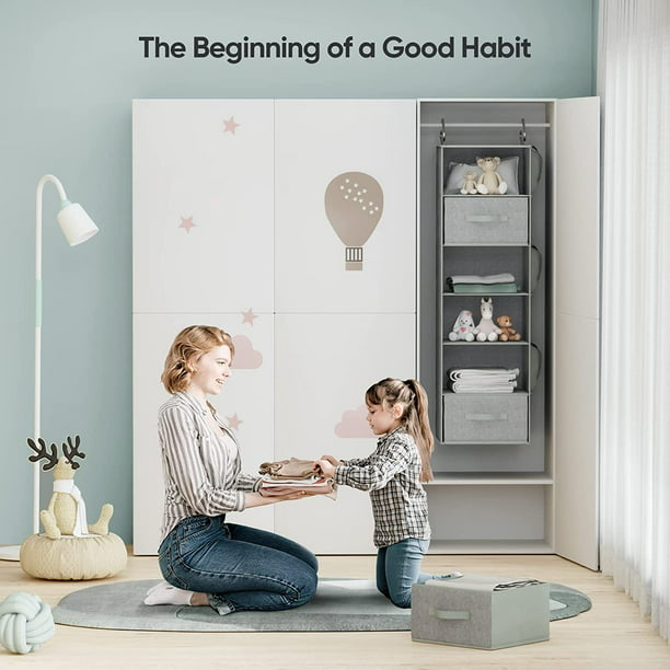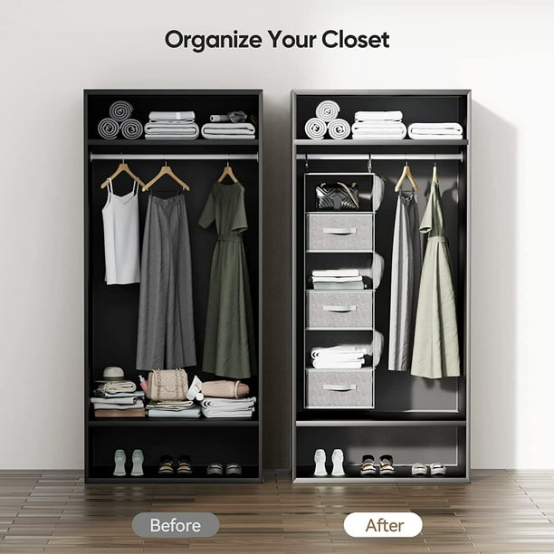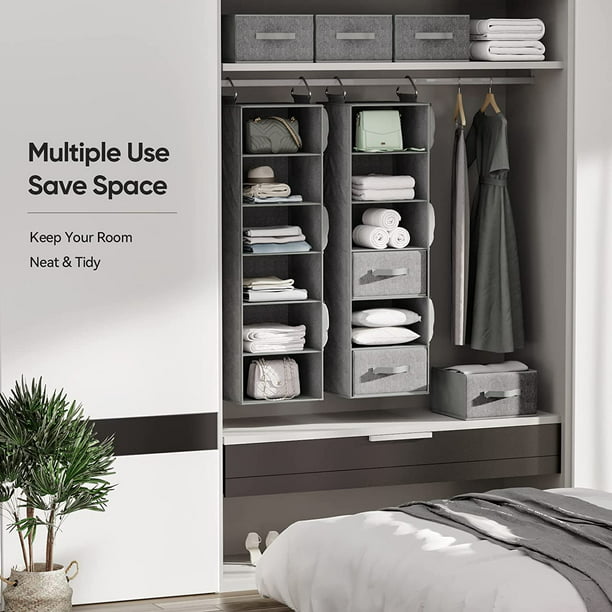 - PRACTICAL CLOSET ORGANIZER: Our hanging closet organizer with drawers uses the vertical space in your closet to maximize capacity. The contemporary fabric and stylish color fits in well with any design style and aesthetic