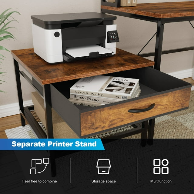 - WITH SEPARATE PRINTER STAND: The separate printer stand with fabric drawer and storage shelf is versatile for use under the desk, beside the desk, or in a totally different place