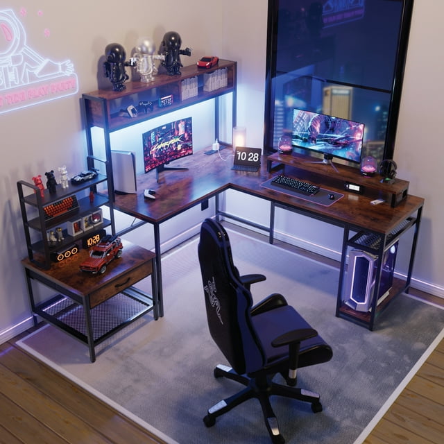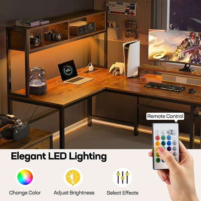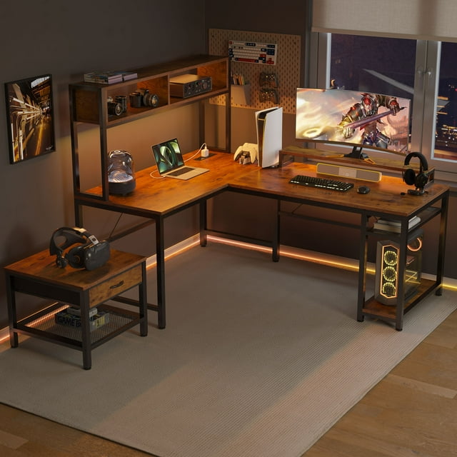 67'' L Shaped Computer Desk with Hutch & Monitor Stand Reversible L-Shaped Gaming Desk with Power Outlet & LED Strip for Home Office, Brown - Walmart.com