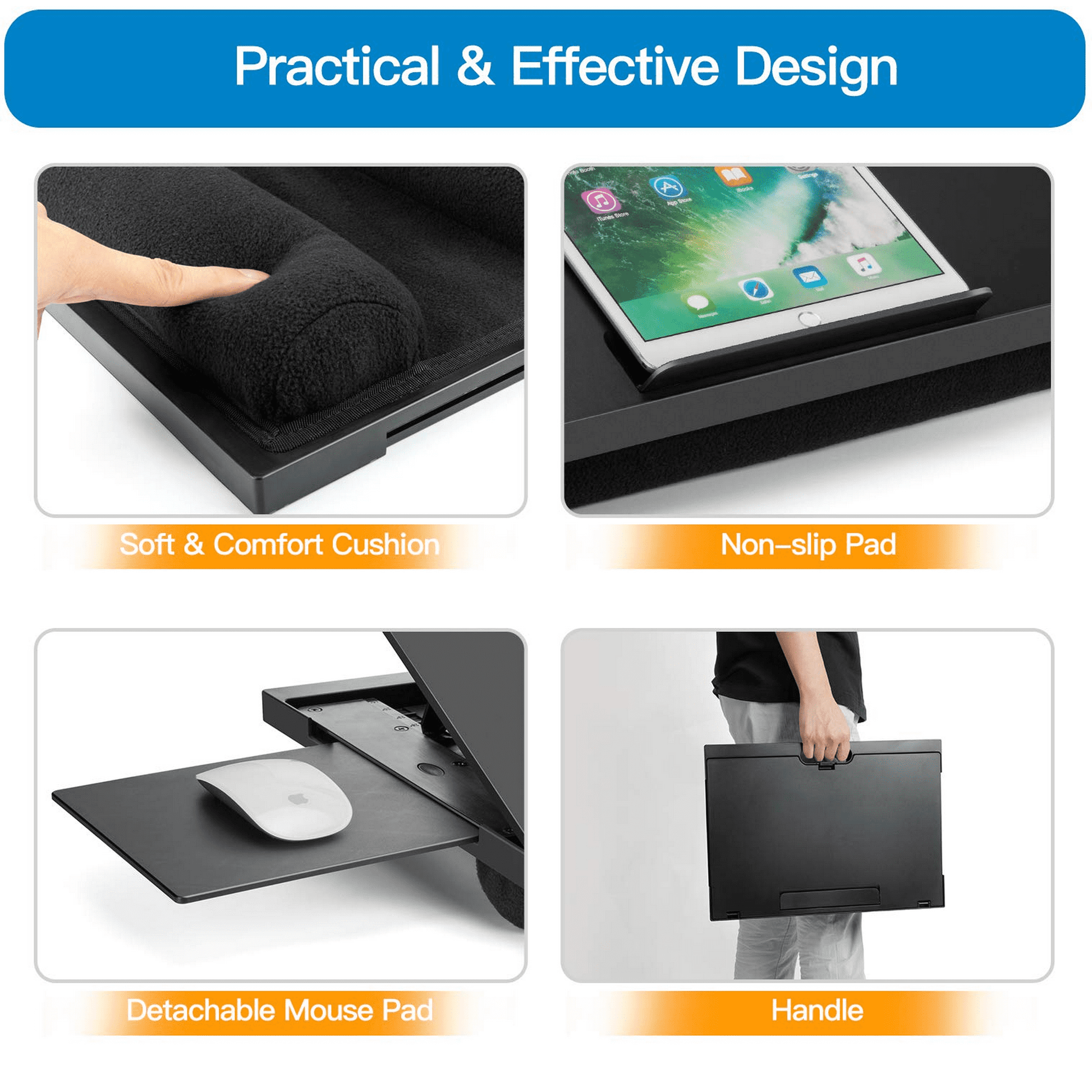 - 【Comfortable Cushions】This lap desk has 2 soft cushions that mold to your knees to provide comfort and stability.
