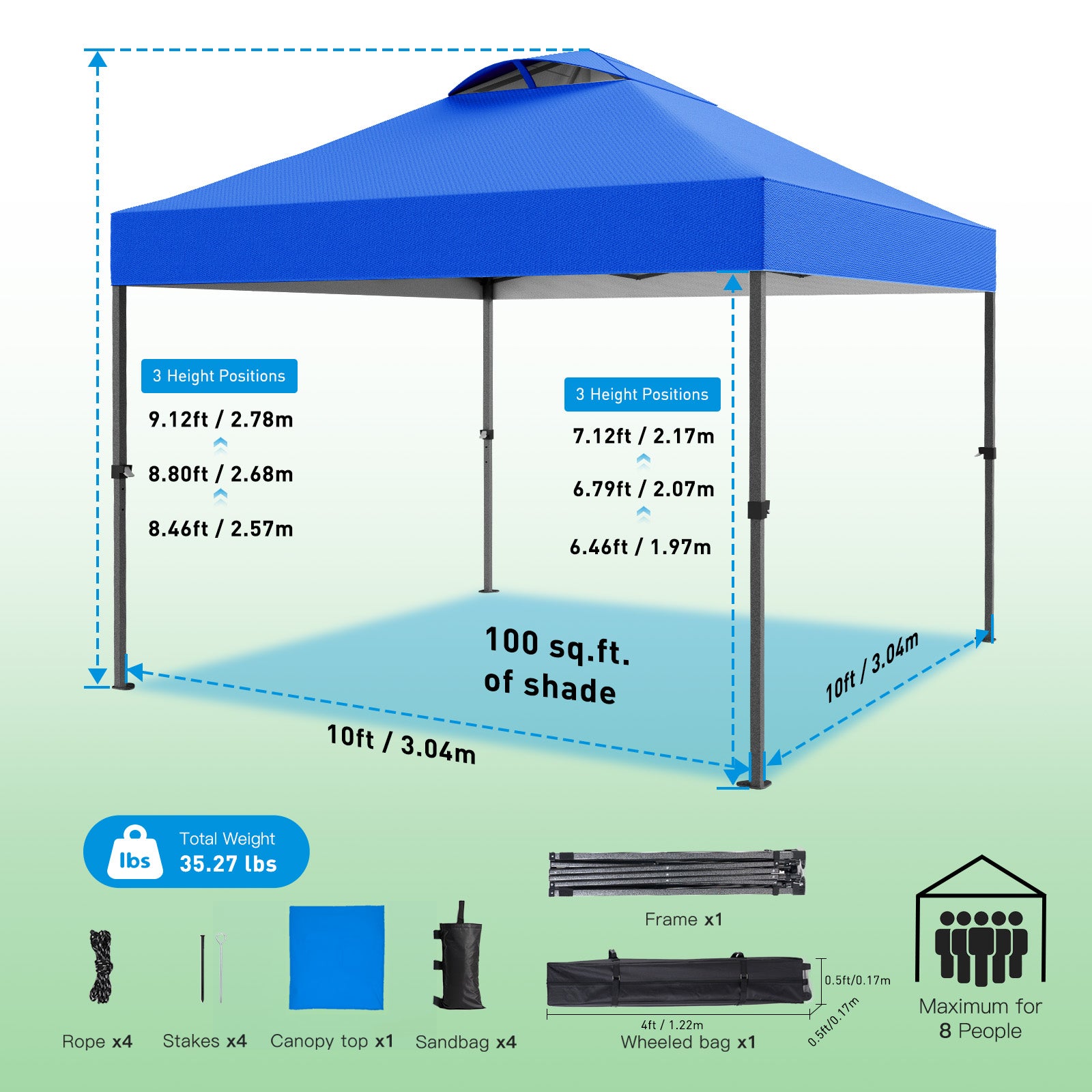 【Easy Setup with One Button】The CHITOOMA 10x10 pop-up canopy tent is equipped with one-push center lock technology for effortless setup. With a single push, the central hub locks the poles securely in place. Choose from three adjustable sidewall heights (77inches, 81inches, and 85inches) to create more headroom and a better space for your activities.