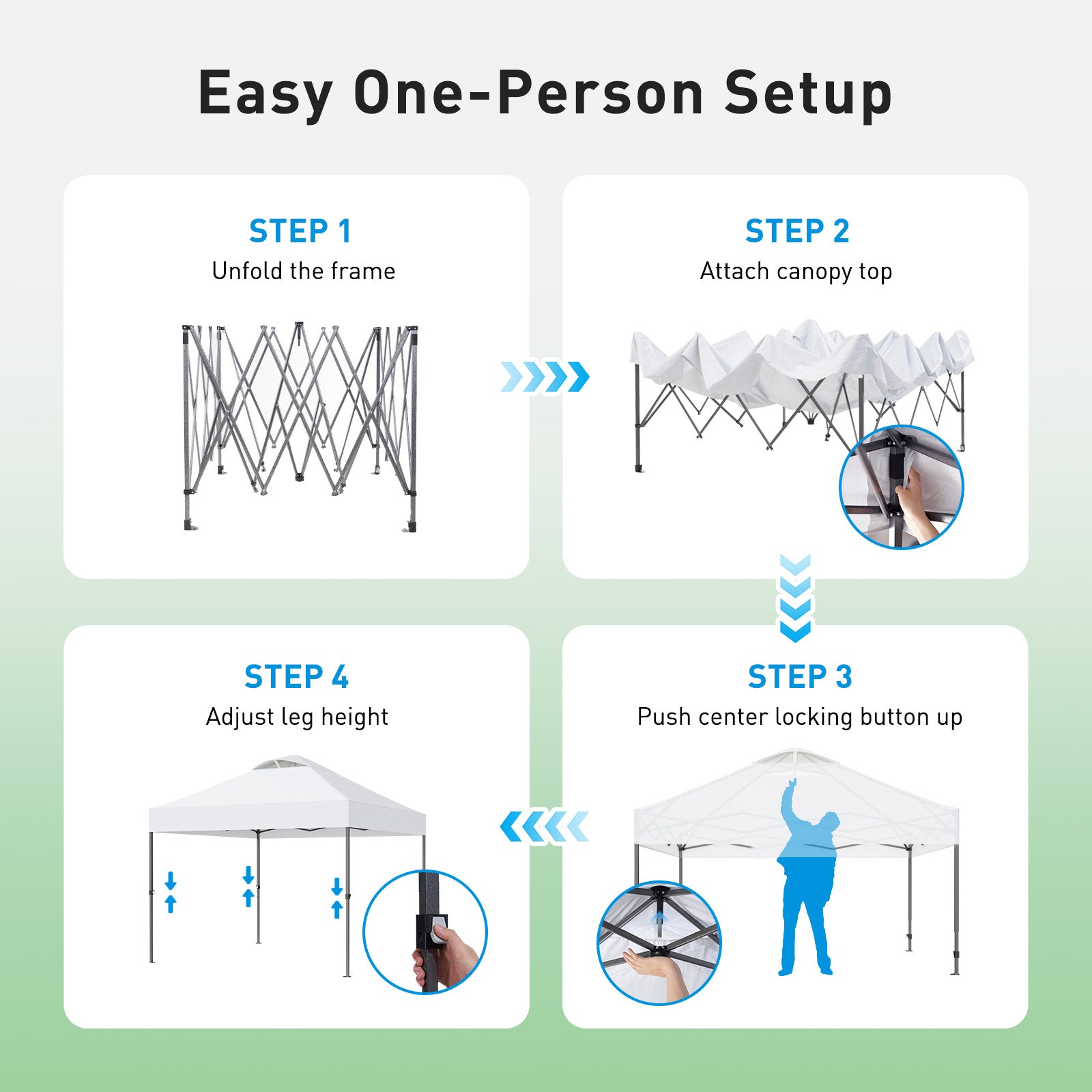 【Easy Setup with One Button】The CHITOOMA 10x10 pop-up canopy tent is equipped with one-push center lock technology for effortless setup. With a single push, the central hub locks the poles securely in place. Choose from three adjustable sidewall heights (77inches, 81inches, and 85inches) to create more headroom and a better space for your activities.