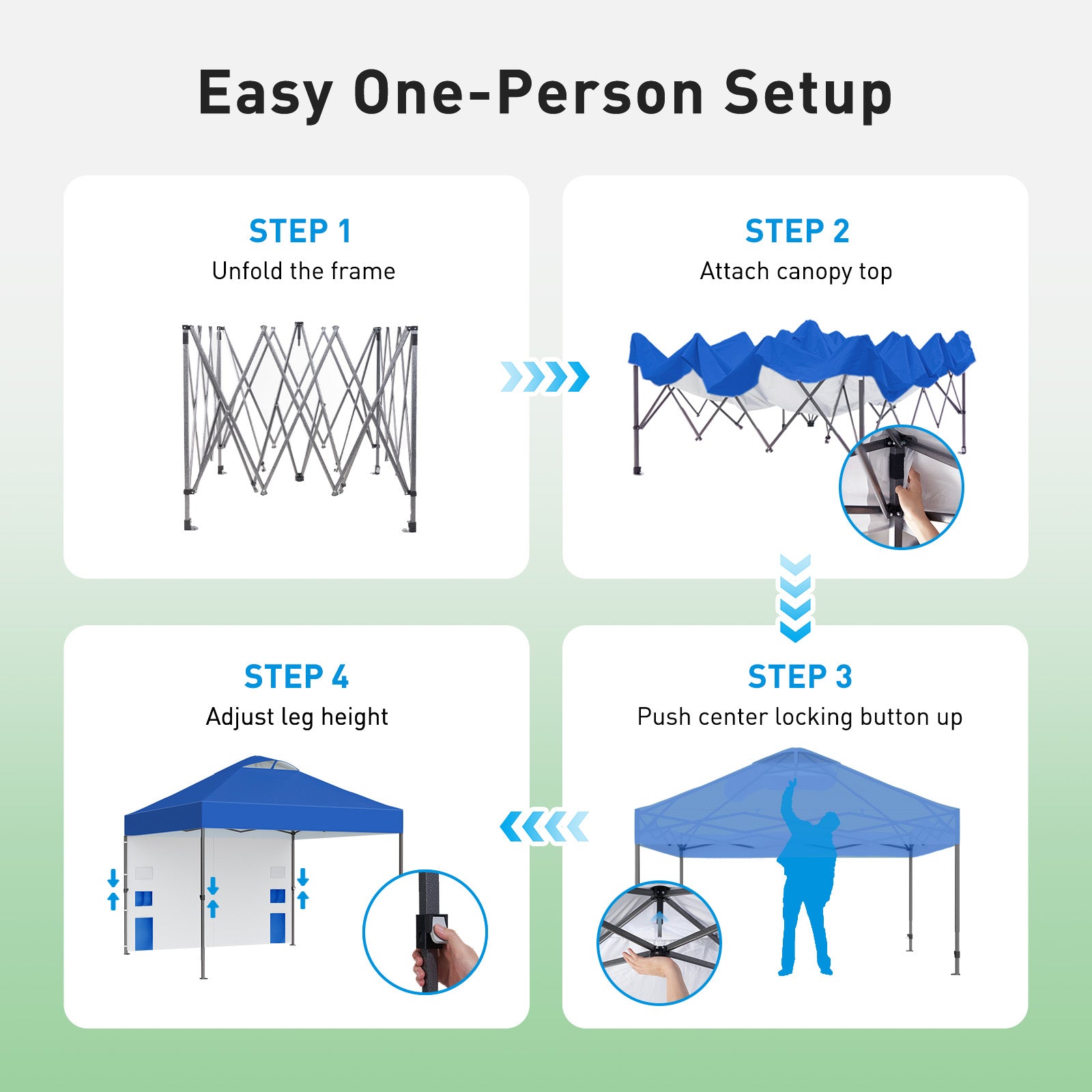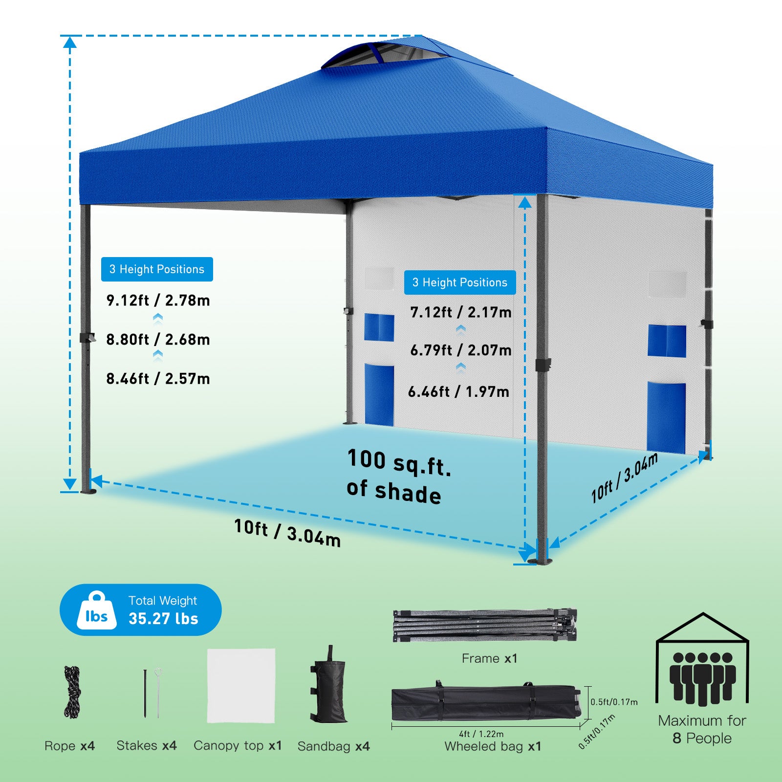 【Easy Setup with One Button】The CHITOOMA 10x10 pop-up canopy tent is equipped with one-push center lock technology for effortless setup. With a single push, the central hub locks the poles securely in place. Choose from three adjustable sidewall heights (77inches, 81inches, and 85inches) to create more headroom and a better space for your activities.
