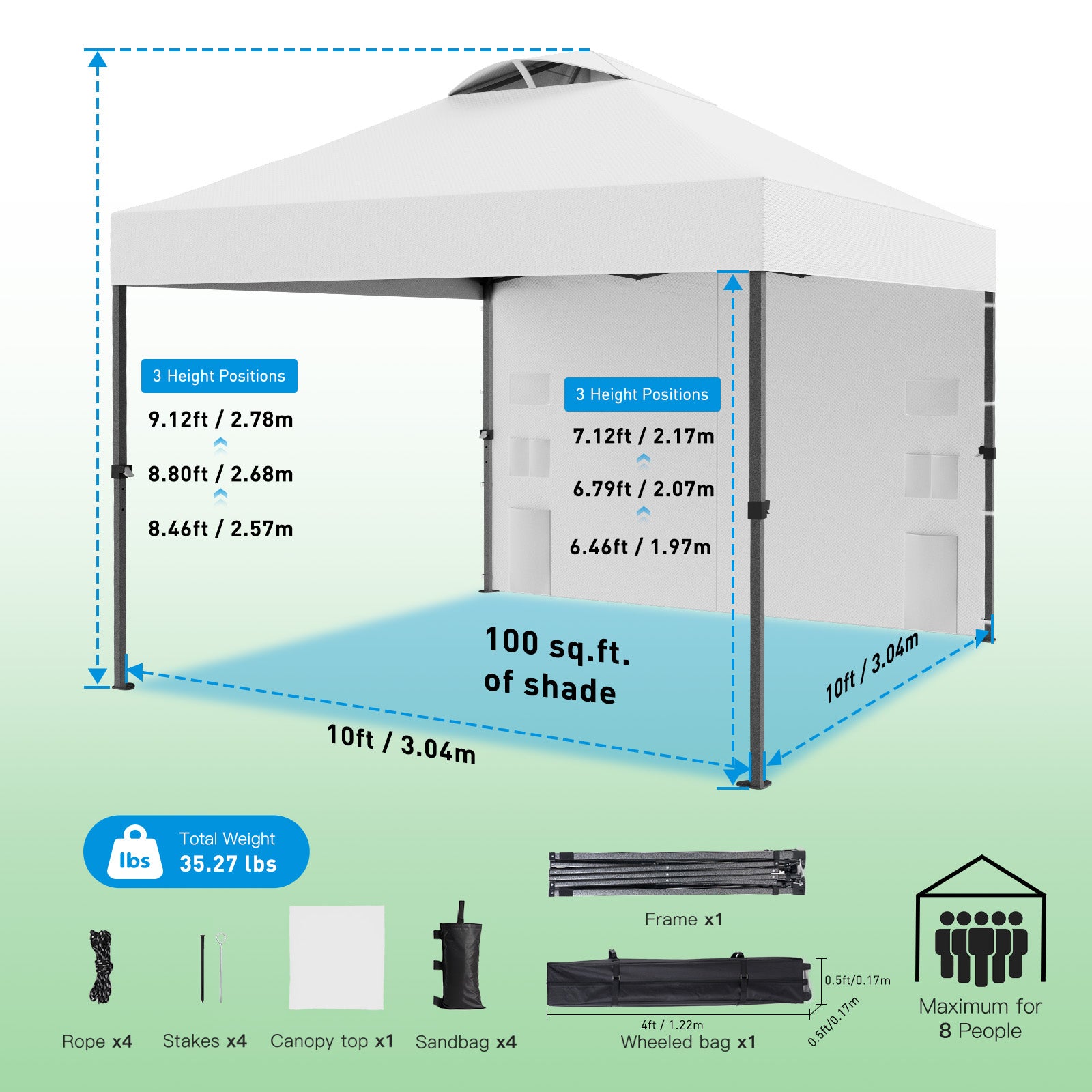 【What Is Included】This instant pop-up canopy tent comes complete with a convenient storage bag with wheels for easy transport. It also includes a three-position height adjustable frame, canopy top, 8 stakes, 4 guy ropes, 4 weight bags.