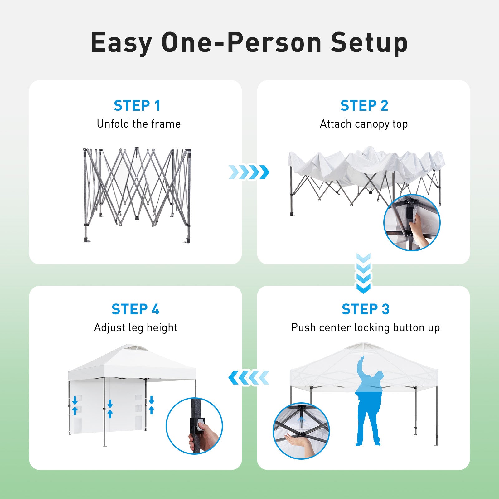 【Easy Setup with One Button】The CHITOOMA 10x10 pop-up canopy tent is equipped with one-push center lock technology for effortless setup. With a single push, the central hub locks the poles securely in place. Choose from three adjustable sidewall heights (77inches, 81inches, and 85inches) to create more headroom and a better space for your activities.