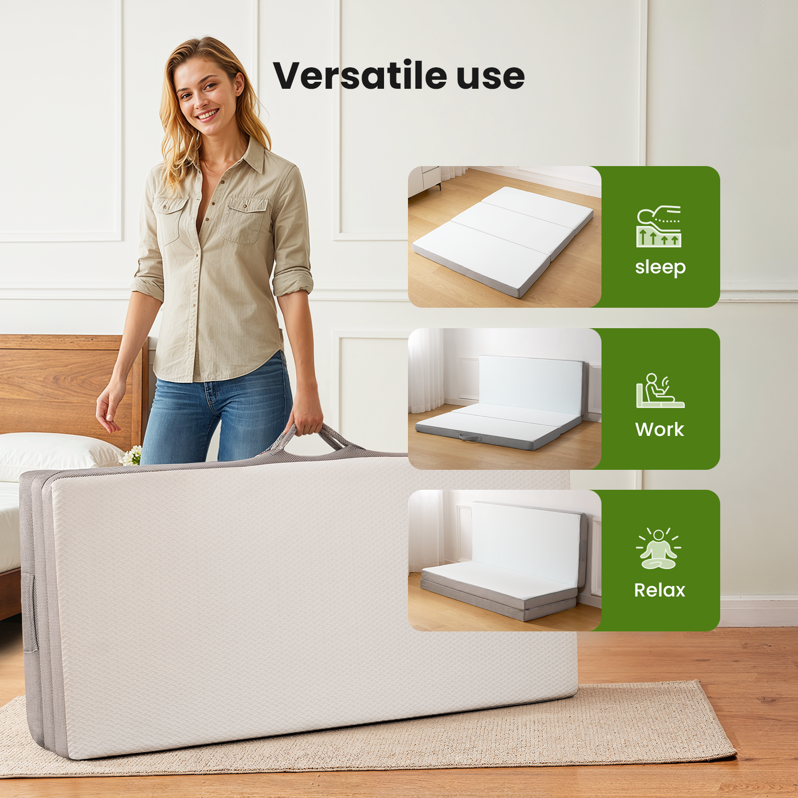 Easy to Carry: The Tri-fold Mattresses combined with the ability to fold into a compact size, makes tri-fold mattresses highly portable. Whether going camping, visiting friends, or simply rearranging furniture, these mattress can be effortlessly transport without hassle