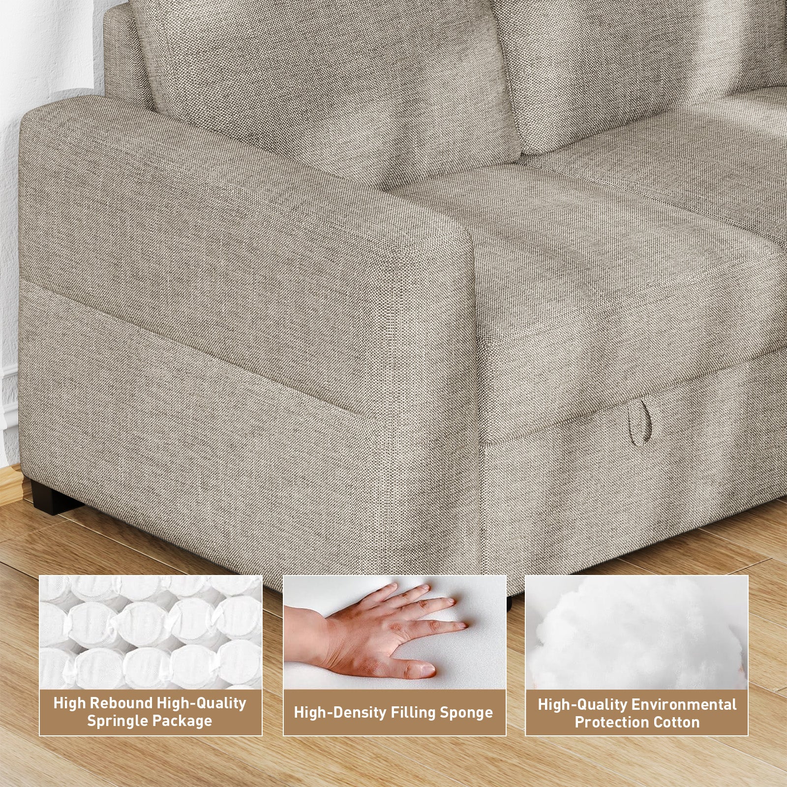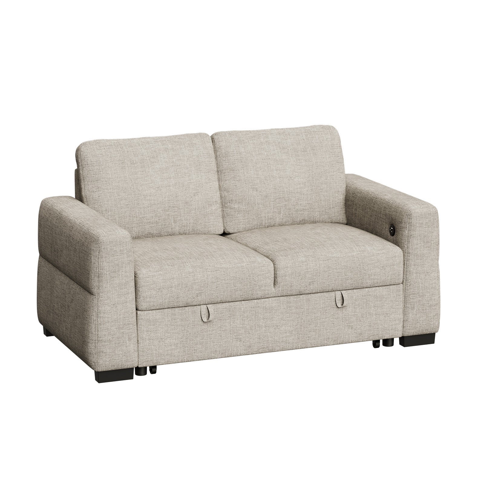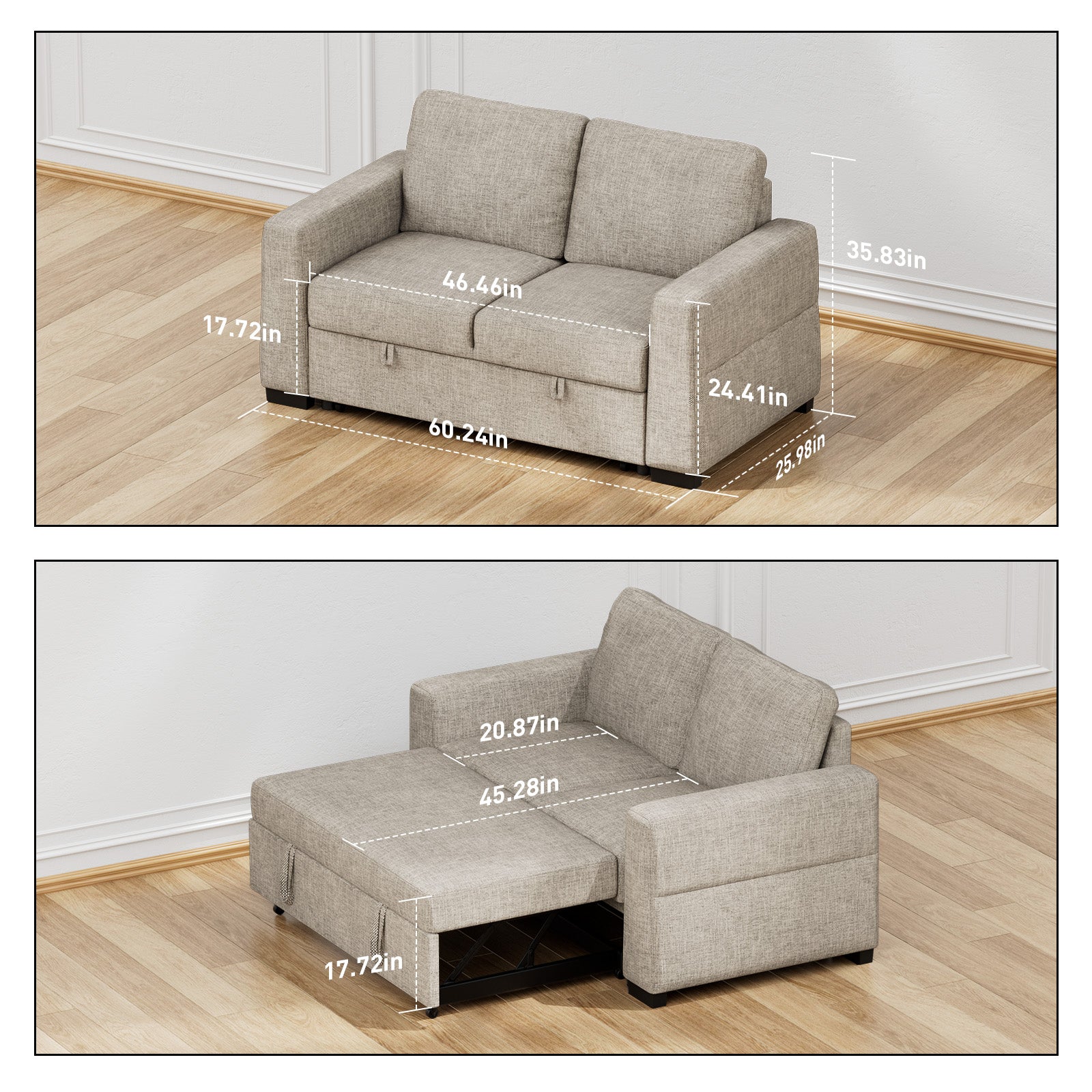CHITOOMA 60'' Linen Pull Out Sofa Bed Convertible Sleeper Couch with Charging Port, Upholstered Sectional Sofa with 2 Pillows, Reclining Sofas for Living Room, Beige