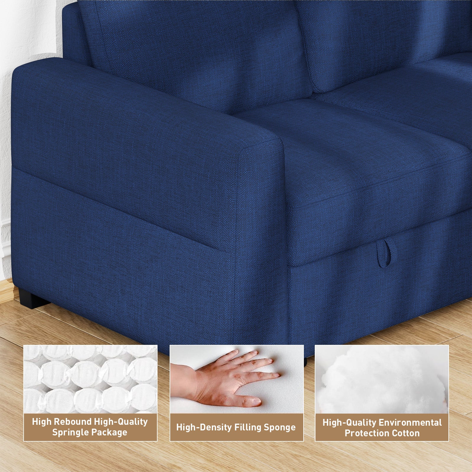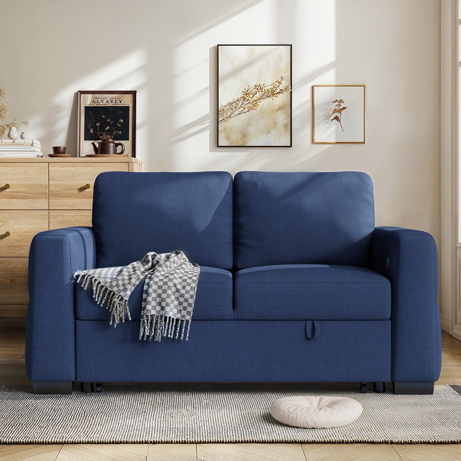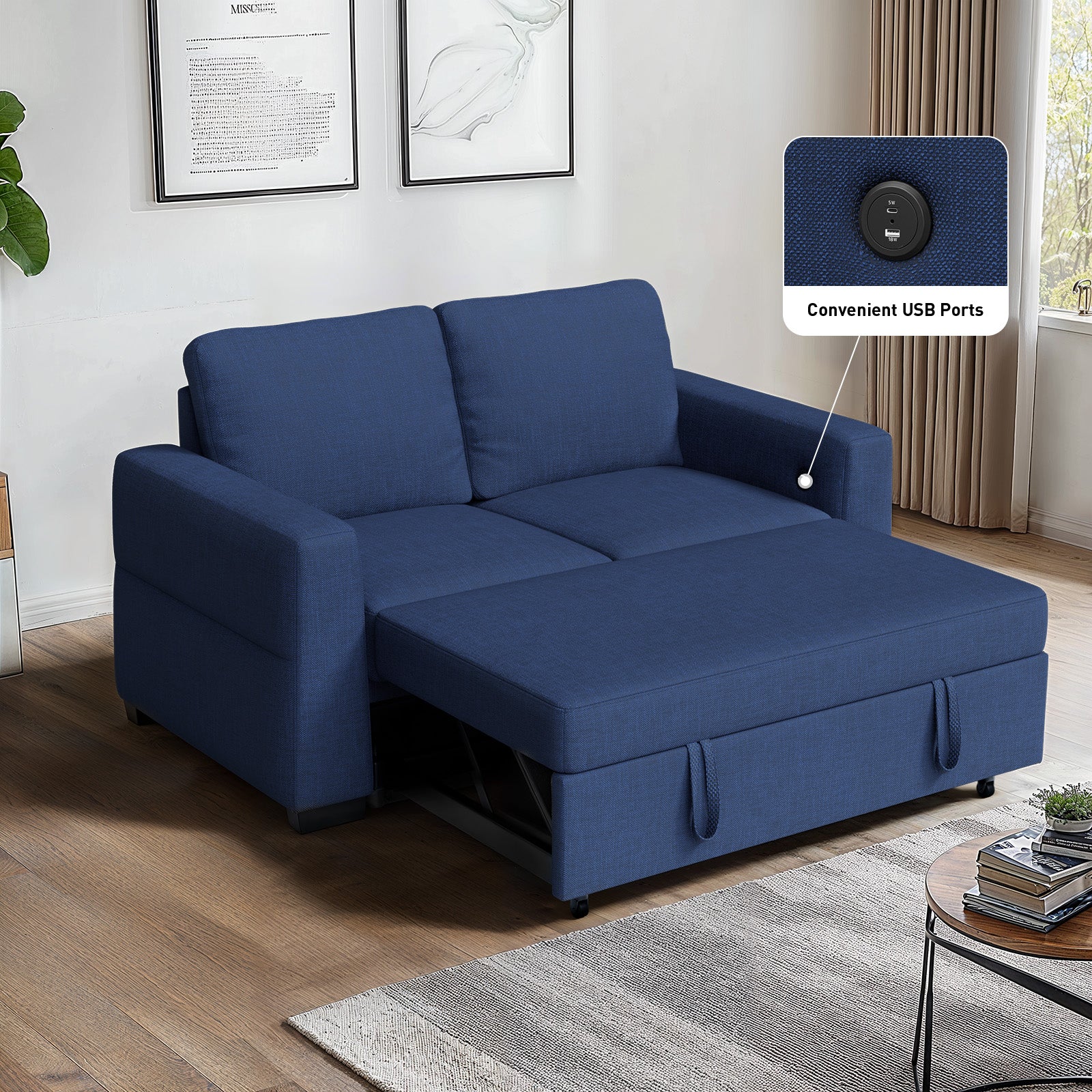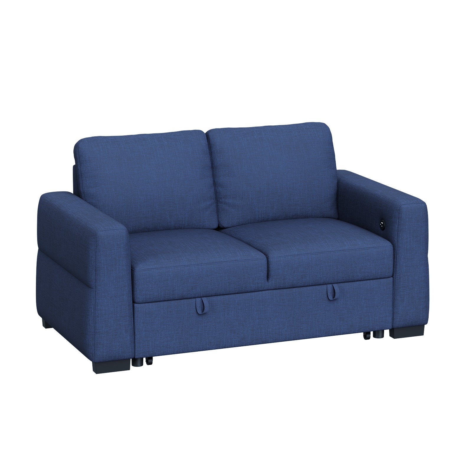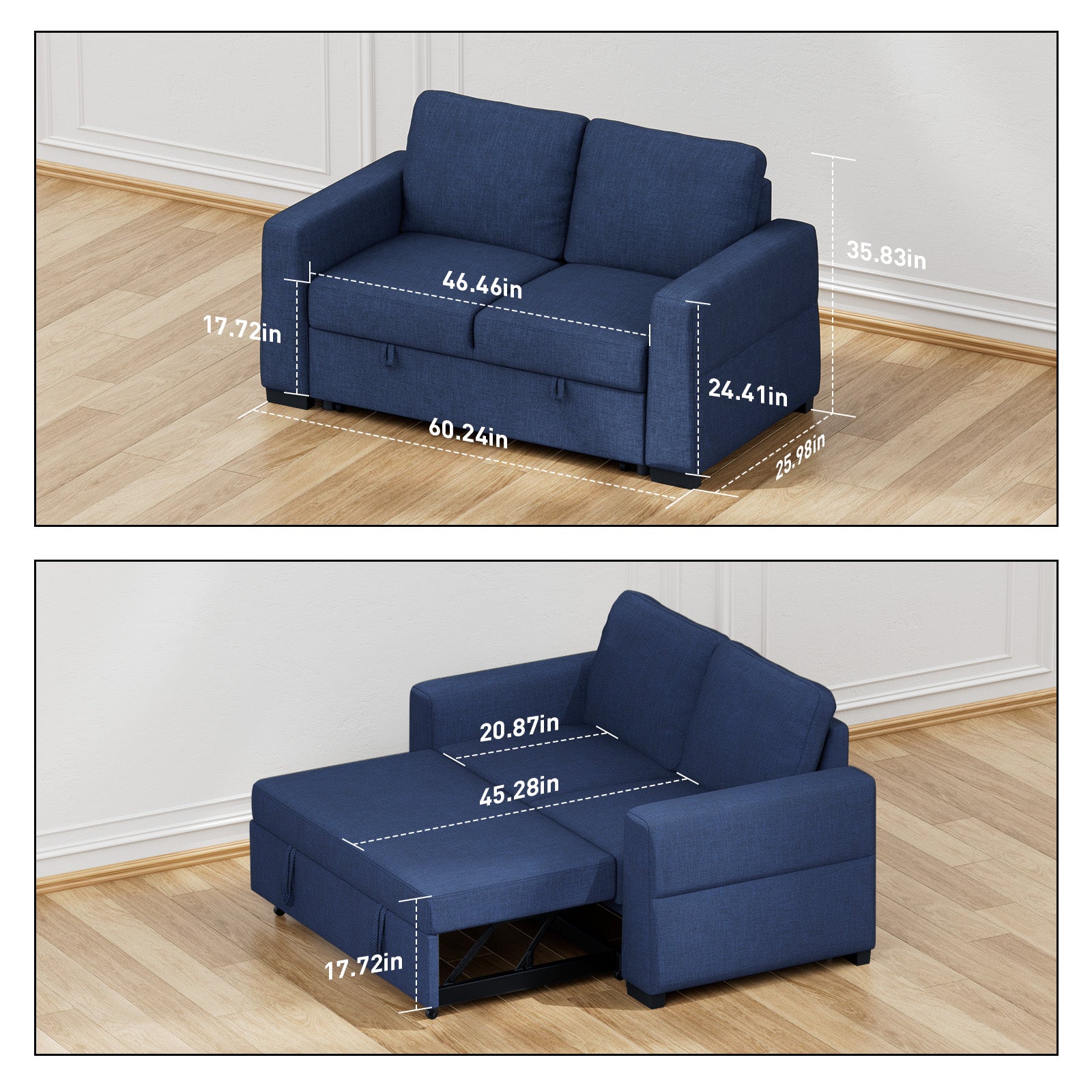CHITOOMA 60'' Linen Pull Out Sofa Bed Convertible Sleeper Couch with Charging Port, Upholstered Sectional Sofa with 2 Pillows, Reclining Sofas for Living Room, Blue