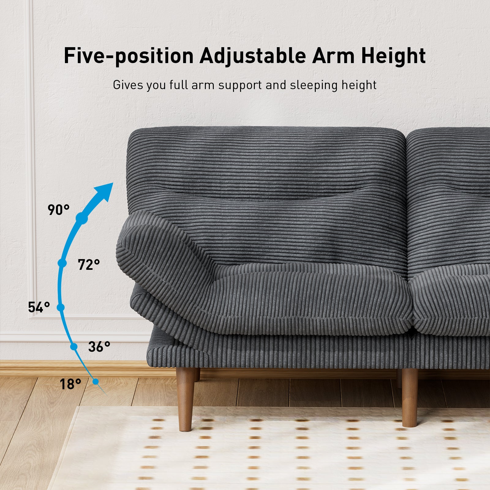 - Convertible & Adjustable Comfort: Designed with a split back and three adjustable angles (120°/160°/180°), it accommodates multiple seating, reclining, and resting needs. The armrests also offer adjustable angles for added flexibility, allowing customized comfort for each user.