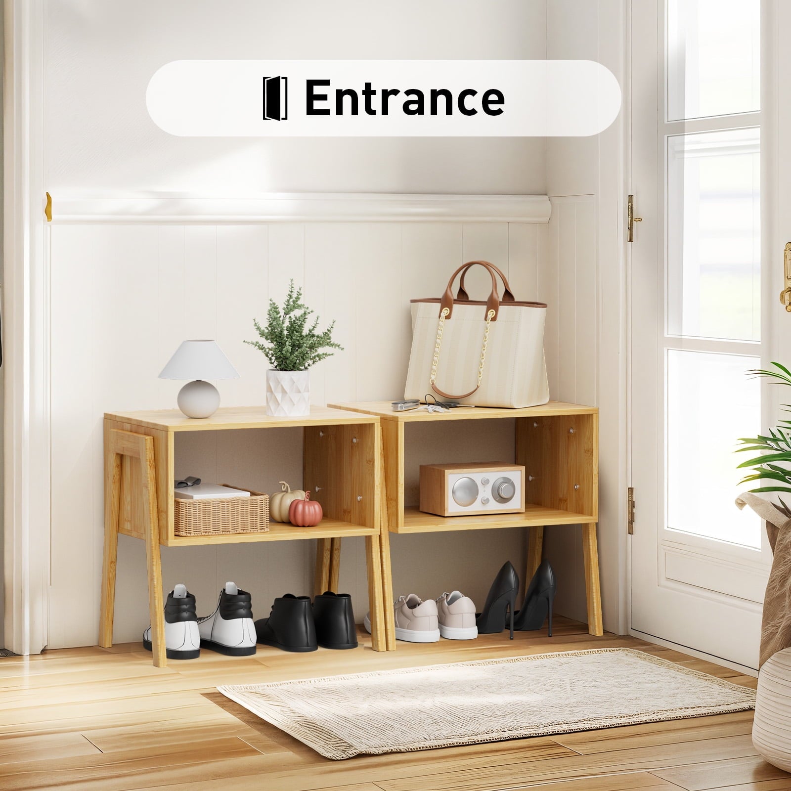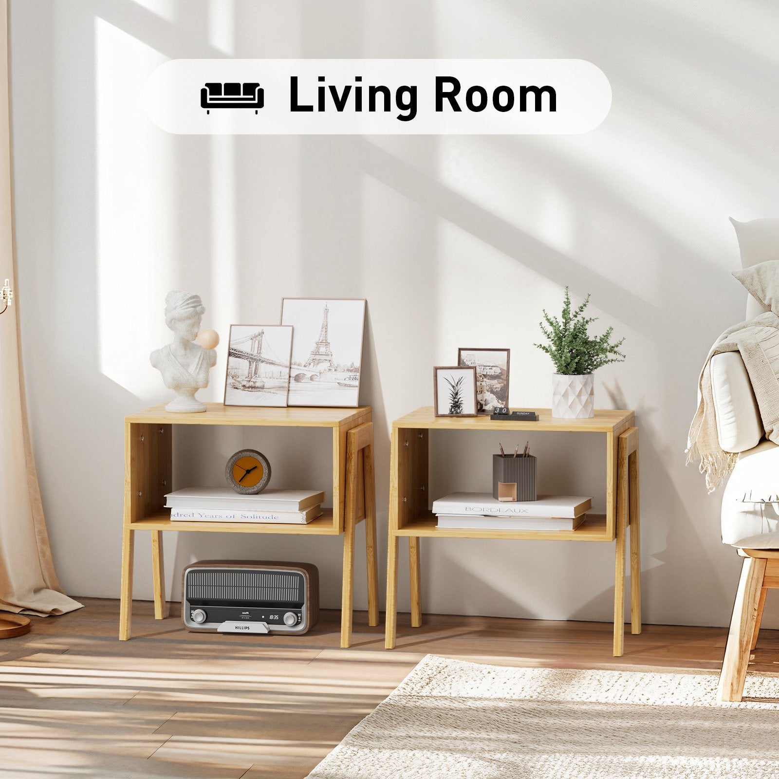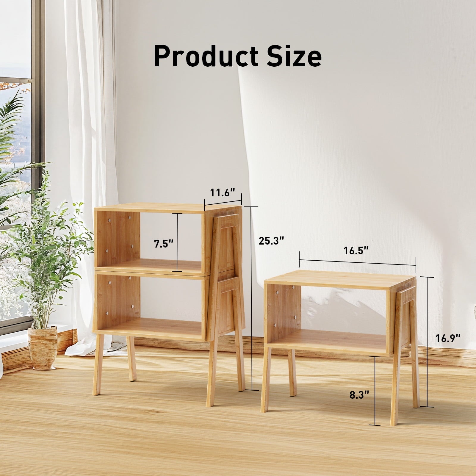 🌴CHITOOMA Set of 2 bamboo nightstands crafted out of heavy-duty bamboo and fitted with 4 thicken feet, are sturdy enough to support daily items (25 lbs each).100% nature bamboo material, no formaldehyde, non-toxic, no odor. Stackable design can not only help you display various layouts but also take less assemble time and effort. This set will make full use of them whether you choose to place in the living room, bedroom, study or reception room!