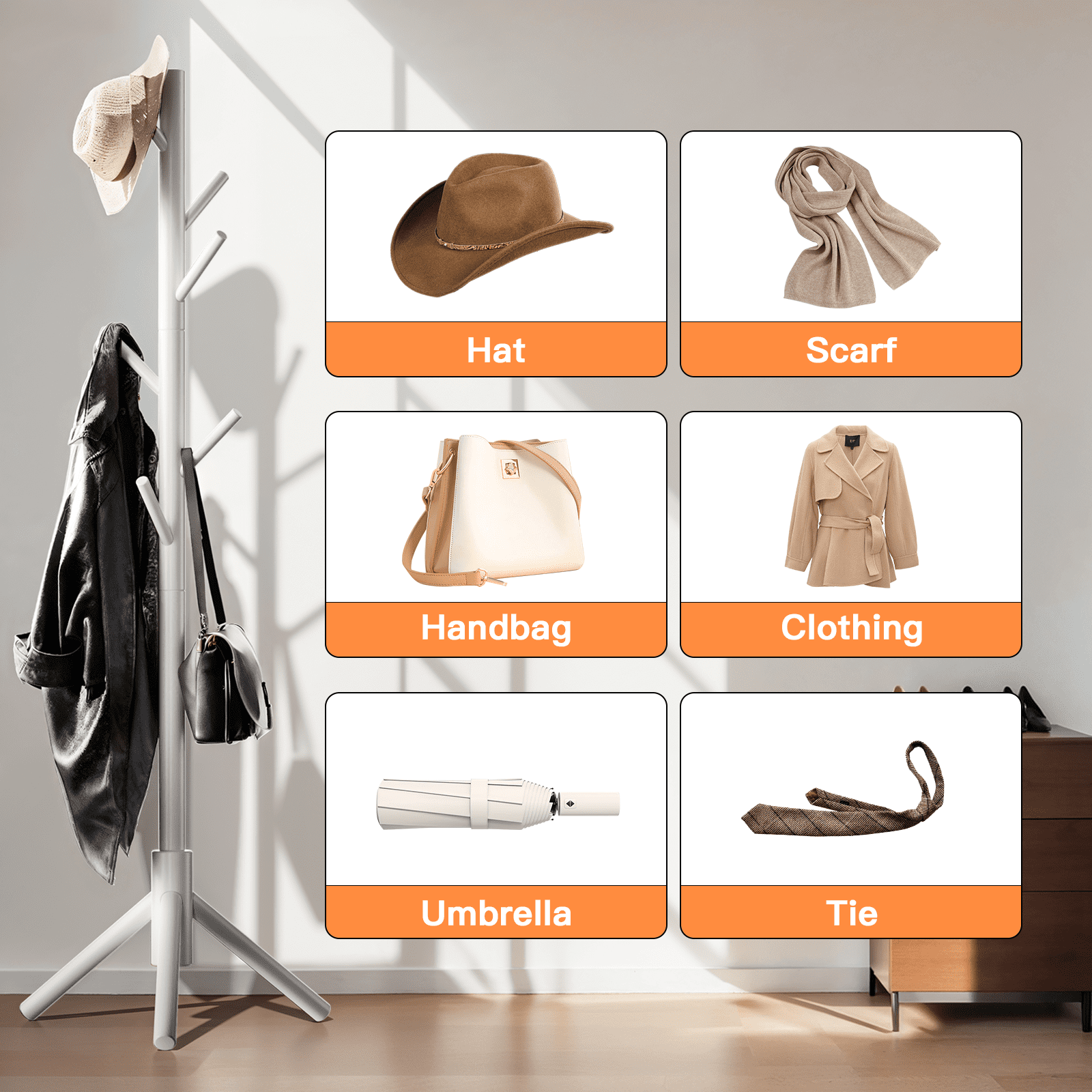 - ENOUGH STORAGE SPACE: This coat rack stand features 8 sturdy hooks that allows you to hang hats, scarves, backpacks, ties, and umbrellas or any other things you want