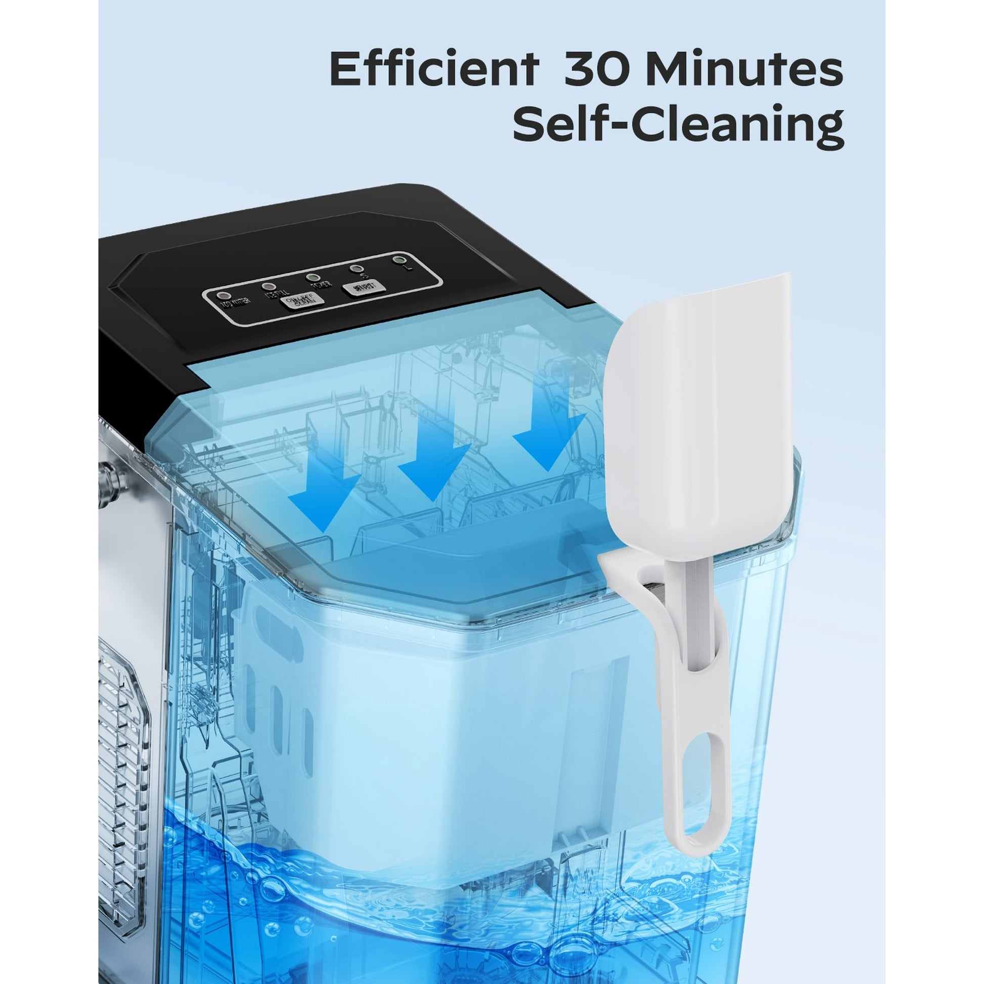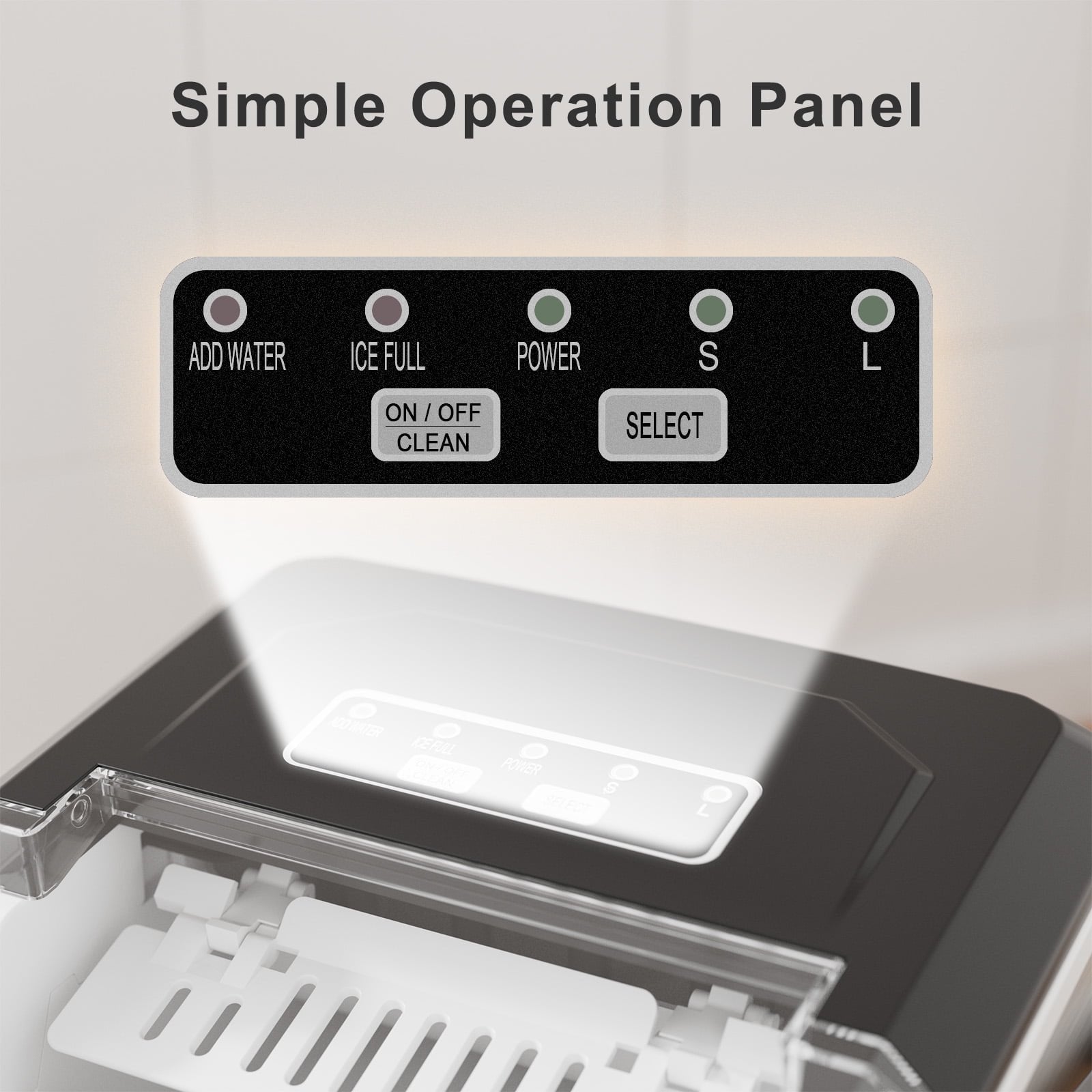 - EASY TO CONTROL: The control panel is very easy to operate. Fill the ice maker with water, press the ON button, select the size of the ice cubes and that’s it. When the water is insufficient or the ice basket is full, the indicator light will turn on.