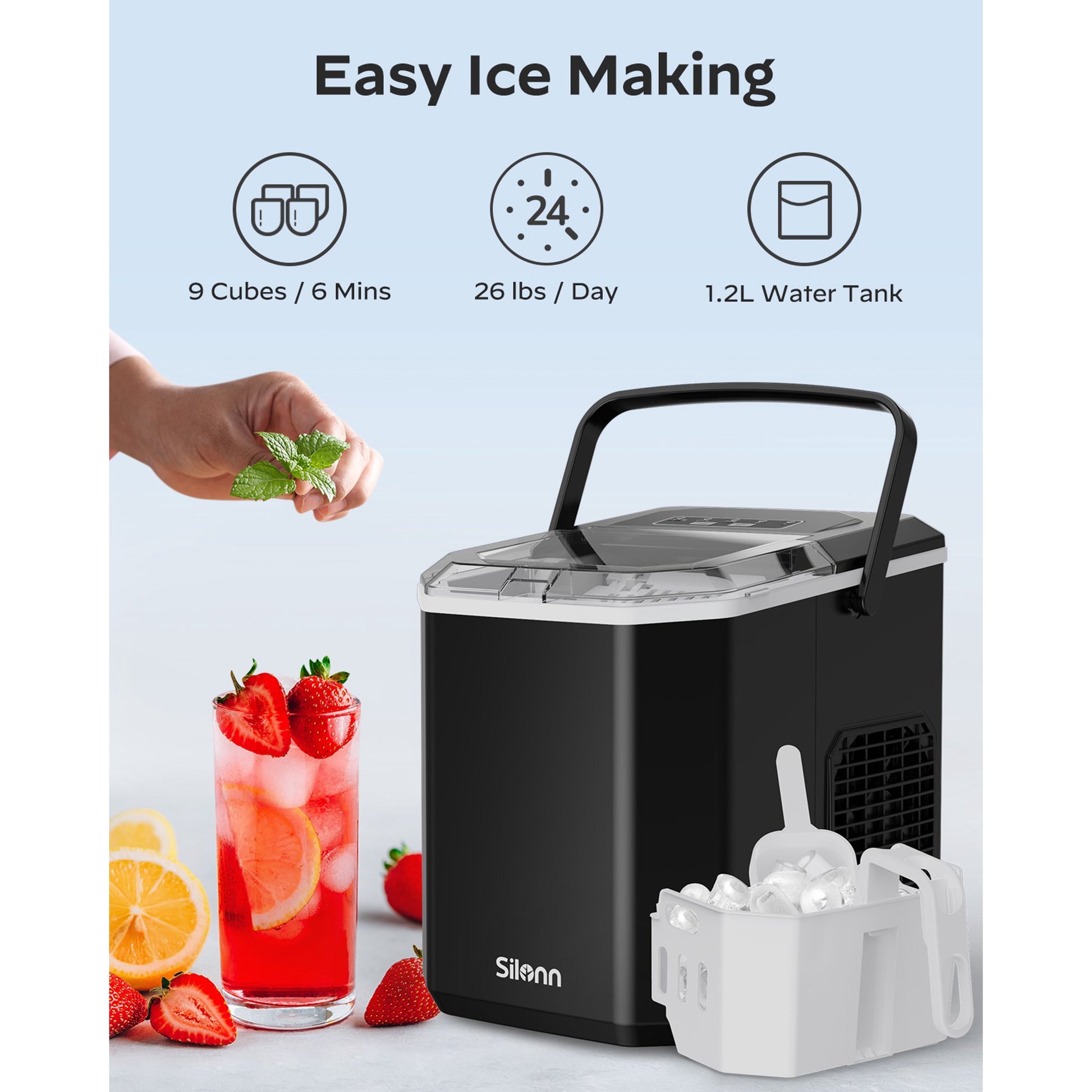 Ever encountered a bullet-shaped ice cube? Our ice makers countertop can produce about 26 pounds of ice per day. Only 6 minutes to produce 9 freezing ice cubes. Quick ice making and sufficient capacity allow you to enjoy the pleasure of chilling and cooling at any moment.