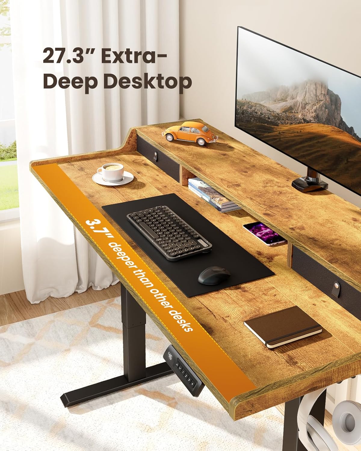 Unmatched Durability and Smooth Operation: Crafted from automotive-grade cold-rolled steel, this standing desk is built to last, supporting up to 132 lbs with ease. The high-performance motor undergoes rigorous testing to endure 50,000 lift cycles, ensuring a long lifespan of smooth, steady adjustments. Enhanced Compatibility for Customizable Monitor Mounting: Designed with an extended 2.95″ rear edge, this desk is compatible with C-clamp monitor mounts, allowing you to securely mount your screens. For added convenience, you can place your monitors directly on the integrated monitor stand, helping to elevate screens to eye level, reducing neck and back strain. Wide Height Adjustment Range for Versatile Use: This height adjustable desk offers a flexible range from 28″ to 47″, making it easy to switch between sitting and standing positions. Whether for working or gaming, this adjustability promotes better posture, enhanced focus, and improved overall well-being. Efficient Storage Options for a Clutter-Free Workspace: The desk boasts a generous 27.3″ desktop, complete with two storage drawers for keeping office supplies organized and hidden from view. Additionally, the open cubicle beneath the desktop offers a practical space for your keyboard, mouse, and other accessories, while the monitor riser adds a touch of personality to your desk by showcasing personal items. Smart Ergonomic Features for Comfort and Safety: Featuring 4 customizable height presets, this sit-stand desk allows for quick adjustments at the touch of a button. The raised anti-drop edges keep your items securely in place, while advanced anti-collision detection ensures safe and smooth height transitions, protecting both the desk and surrounding furniture from damage. |