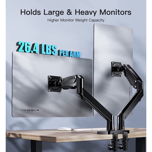 - Dual Monitor Stand for two 17"-35 Screens - The monitor mount with a Strengthened Heavy-duty base and large gas spring arm, strengthen the stability for each dual monitor arm holds screen size up to 35" and 26.4LBS, and this dual monitor mount fits for mounting size 75*75mm or 100*100mm