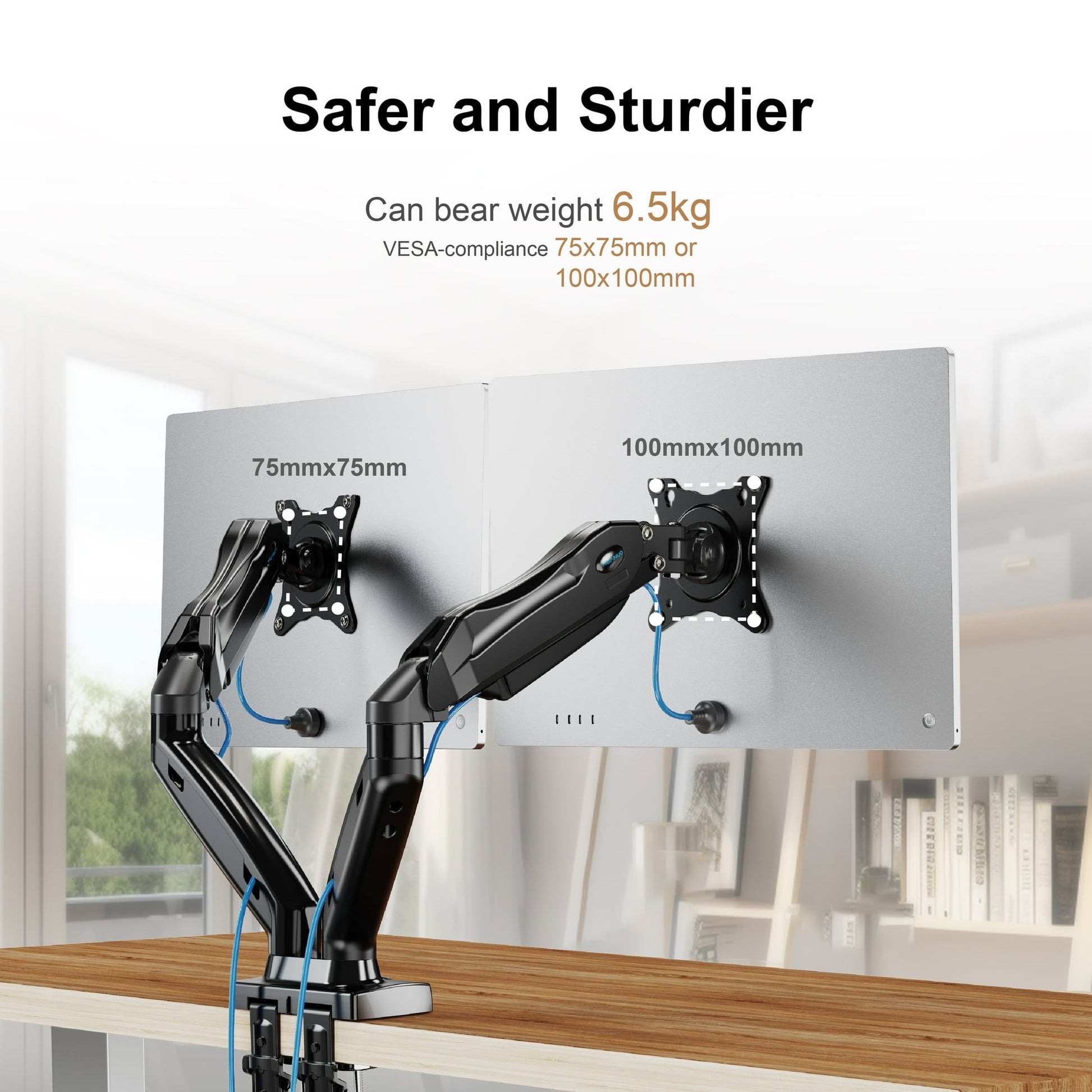 - Fit Your Monitors - Widely fit two 17" to 27" flat/curved monitors with Horizontal x Vertical pattern 75x75 and 100x100 from various brands; Each arm holds 4.4lbs to 14.3lbs