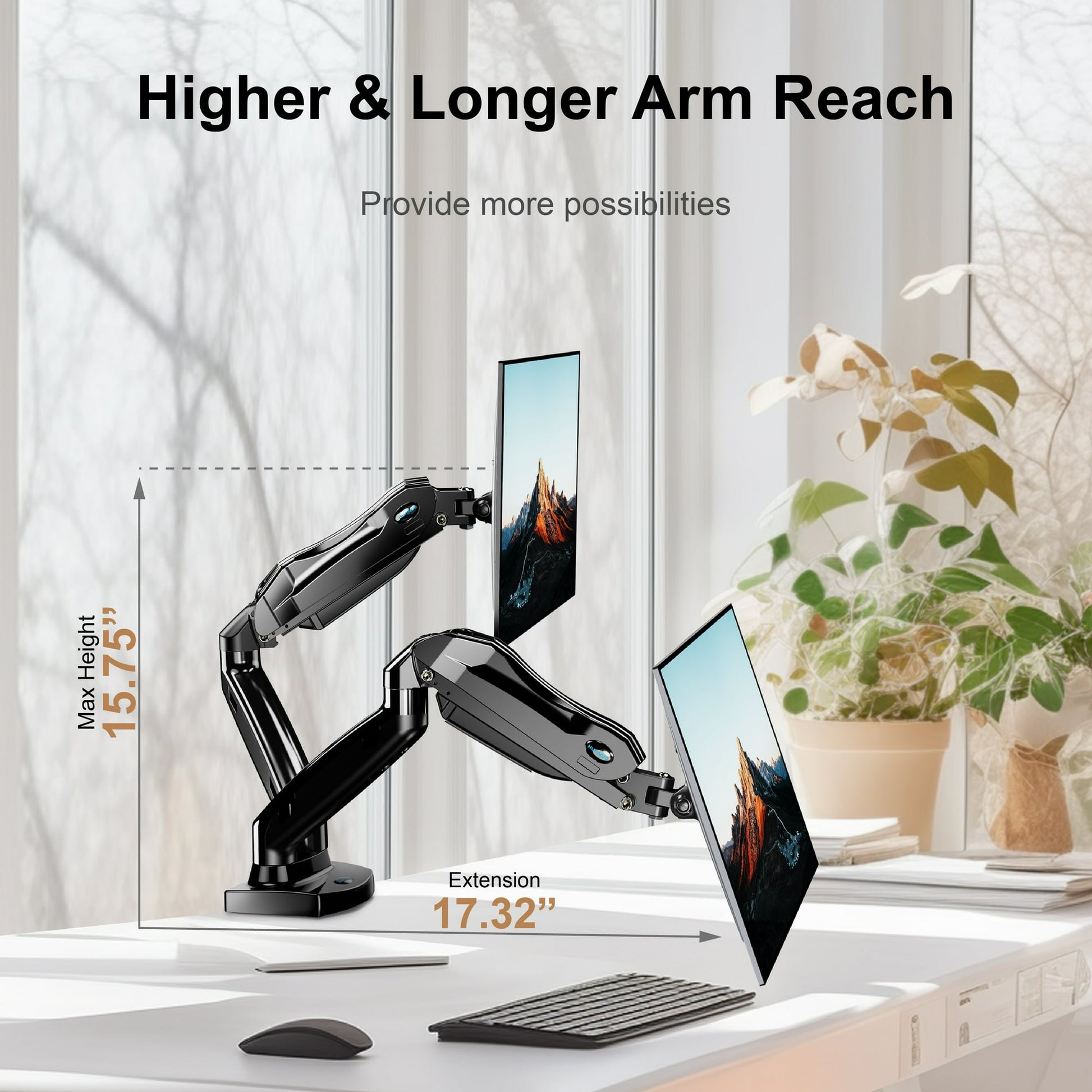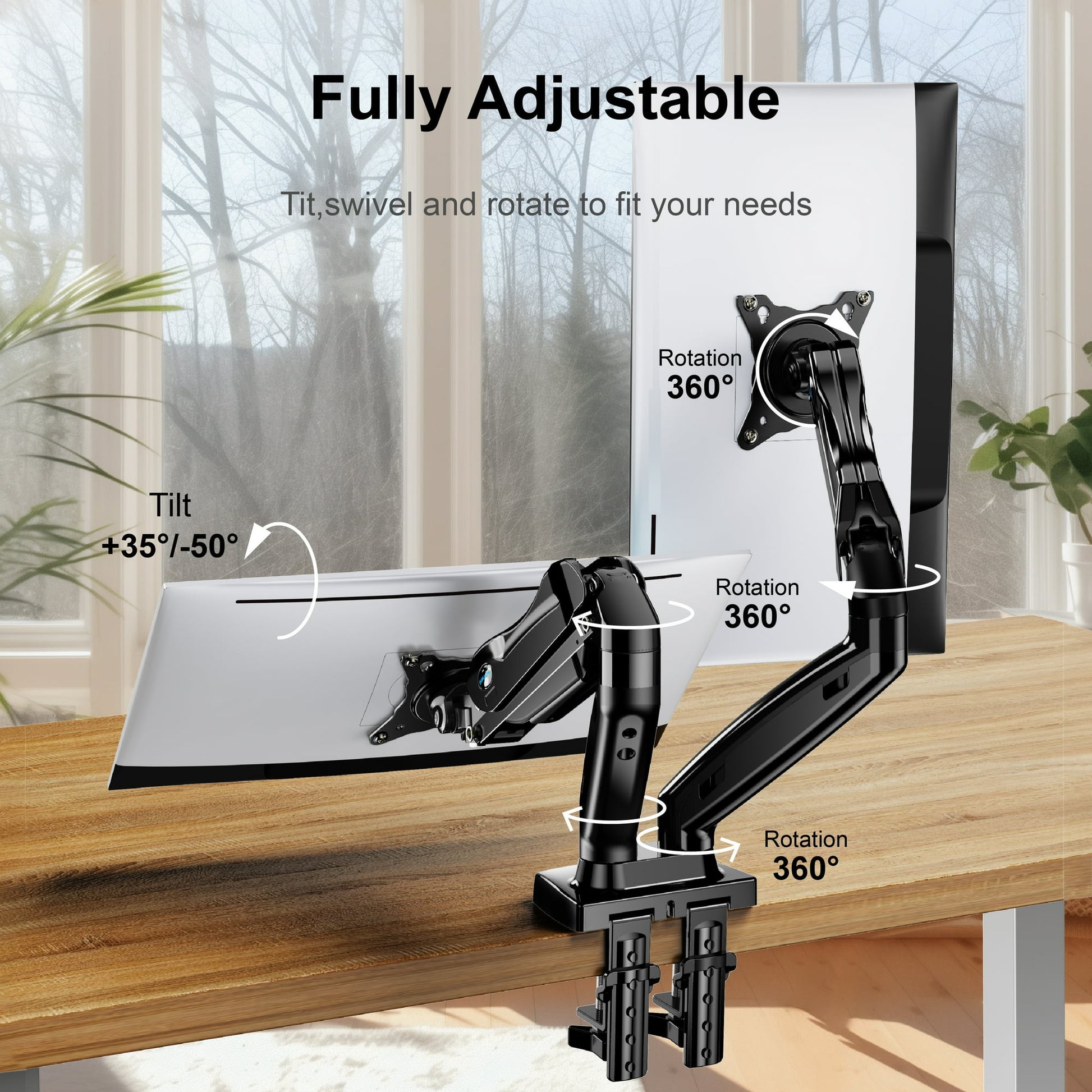 This monitor stand elevates your monitor to eye level so you don't have to bend your neck to watch the screen, reducing stress on your neck, shoulders, and back, and improving your posture. Connect 2 monitors to 1 freestanding desk mounted on the edge of the desk or through the grommet hole to free up a lot of valuable space on your desk and keep your workstation spacious and uncluttered. Each joint of the arm is adjustable to tilt your monitor from -50° to +30°, rotate from -90° to +90°, and rotate 360°. Easily find the best viewing angle you need. Setting the monitor from landscape to portrait mode is a piece of cake.