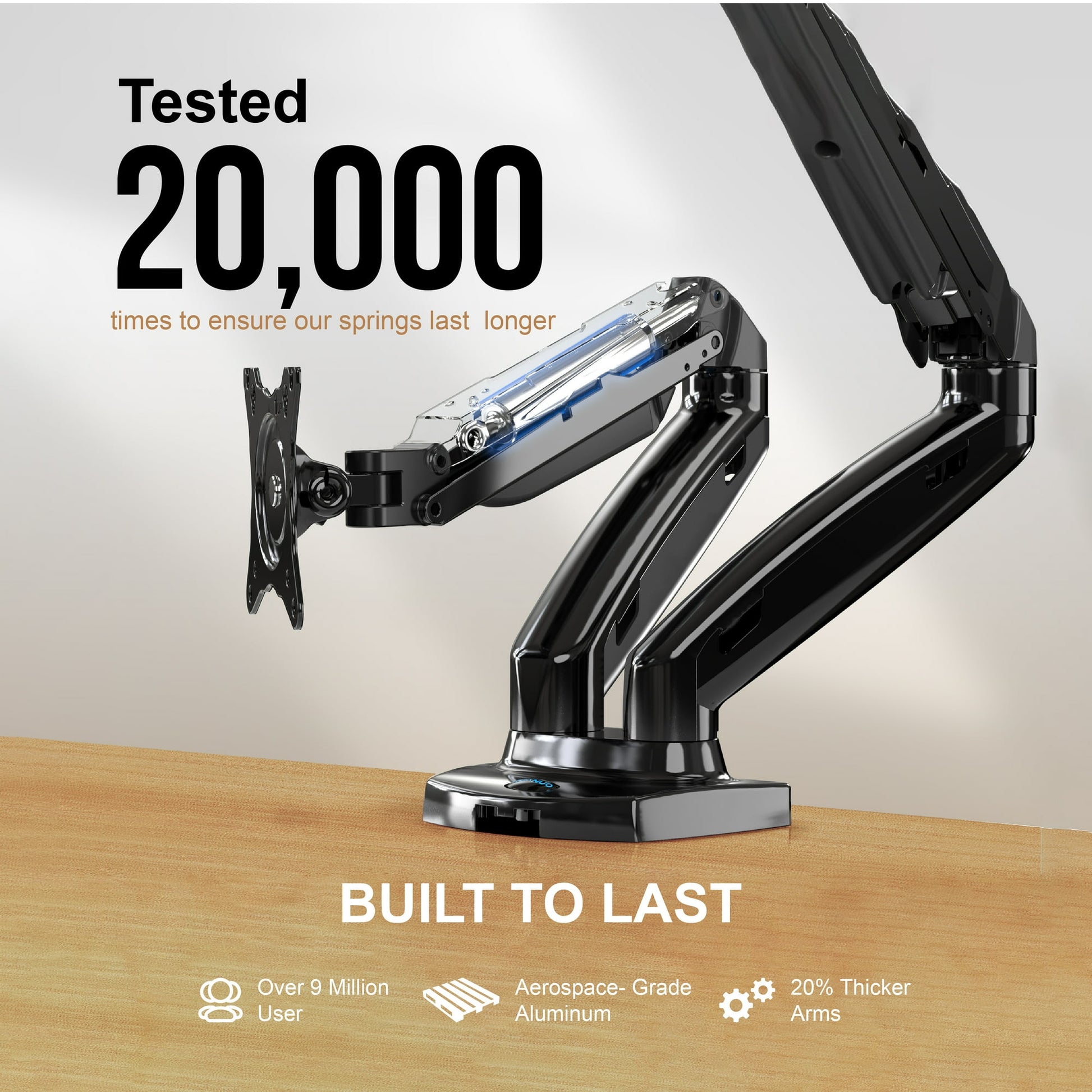 - Install In 10 Min or Less - The 1-piece gas spring arm simplifies the assembly. You just need to choose the proper mounting base and mount the monitors. The setup can be completed in 10 min or less