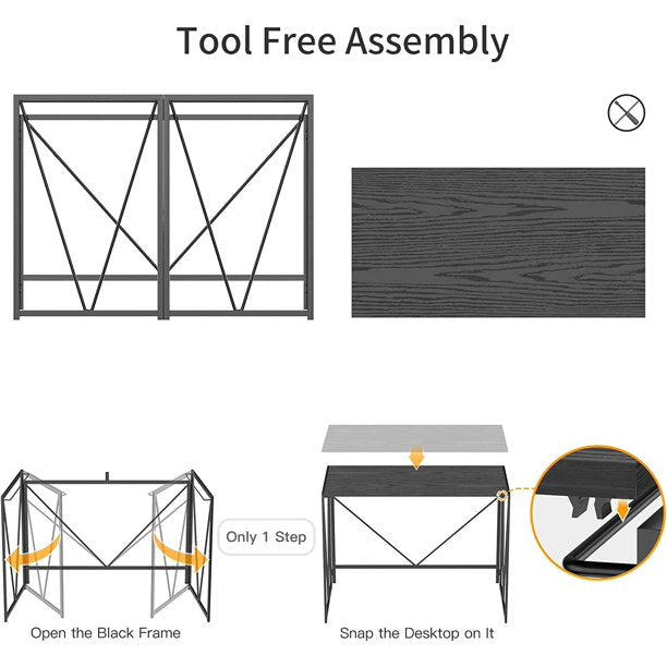 Ideal for tiny homes, apartments or dorms. If you're short on space, this Myfurnideal desk can fold to 2 depth to store anywhere around the house. A V-shaped structure is adopted on three sides to improve the table's load-bearing capacity and add extra stability. Compacted size when folded plus portable enough to be moved with ease by one person. Sturdy industrial black metal frame with flexible hinge design. Uniquely designed, which requires no assembly. Just open the metal frame and connect the desktop on top.