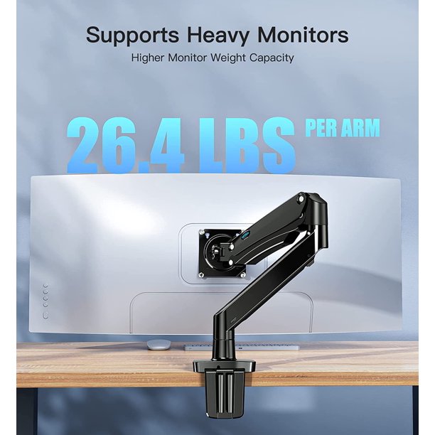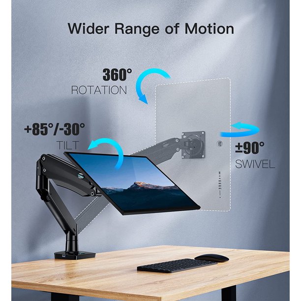 Single monitor desk mount built-in premium gas spring, provides smooth and durable height adjustments, making your monitors freely stay at any height you adjust, the full motion adjustments allow you to find optimal angle and position to make you comfortable and productive. The mount built-in spring ensures smooth height adjustment. Freely adjust your monitor to a proper height to improve your posture while working. Relieves the strain on your neck, shoulders and back. Hold the monitor on a stand-off desktop mounted on the edge of the desk or through a grommet hole, freeing up much valuable space on your desk and making your workstation spacious and clutter-free
