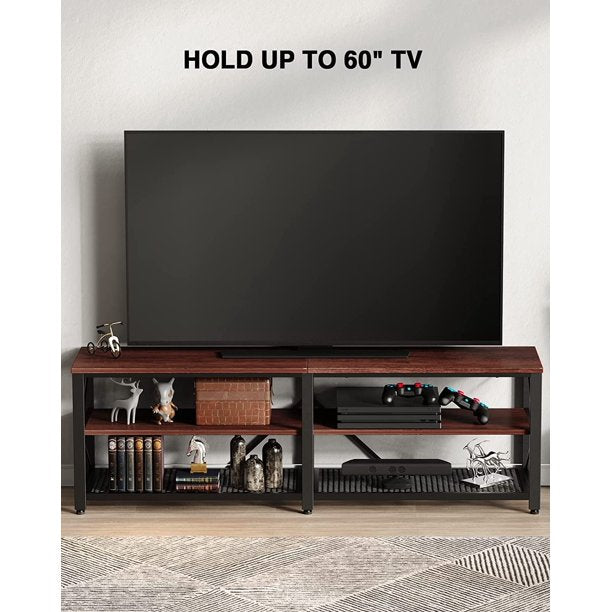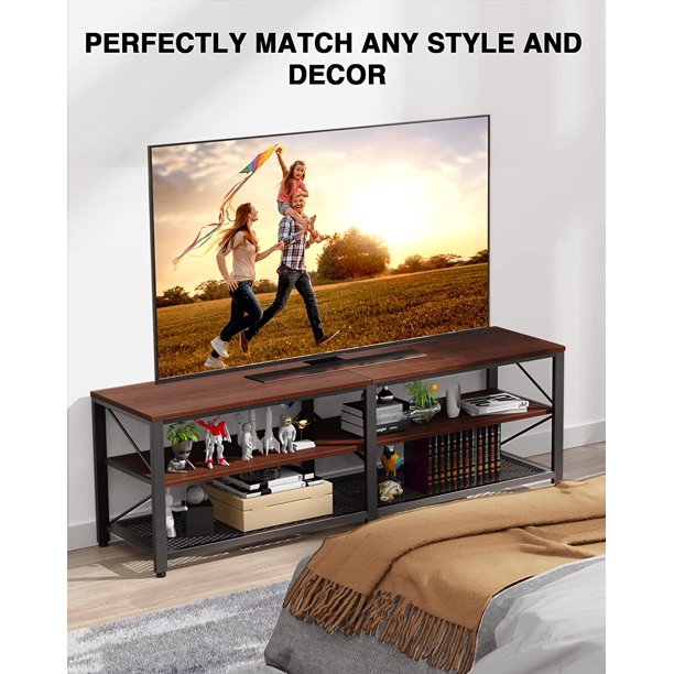 - RETRO INDUSTRIAL CHARM -- A brilliant rendition of retro industrial style. The TV stands clean yet hearty profile is enhanced with a rustic brown finish and black metal frame