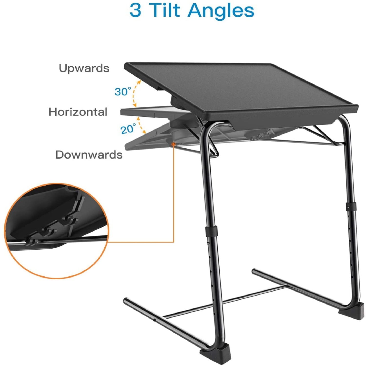 The height of this TV tray table can be adjusted from 19"" to 27"", a total of 6 heights for you to choose from. You may easily adjust it by pressing the buttons to the most suitable height.TV tray tables with 3 tilt angles. In this way, it can be adjusted from horizontal to 1 angle down and 1 angle upwards. The tray table folds completely flat for storage
