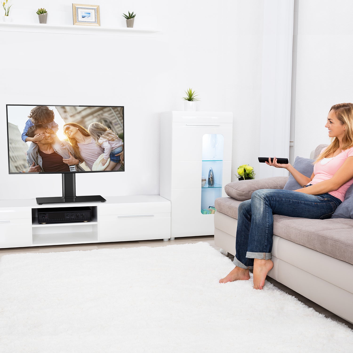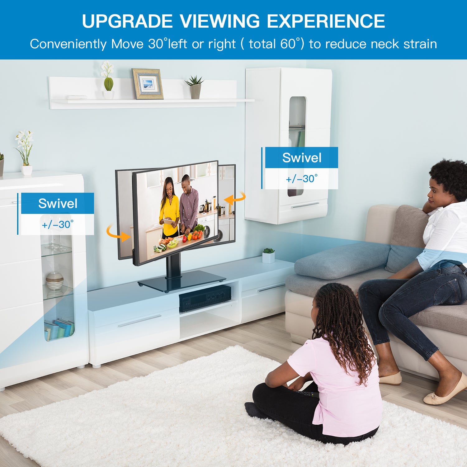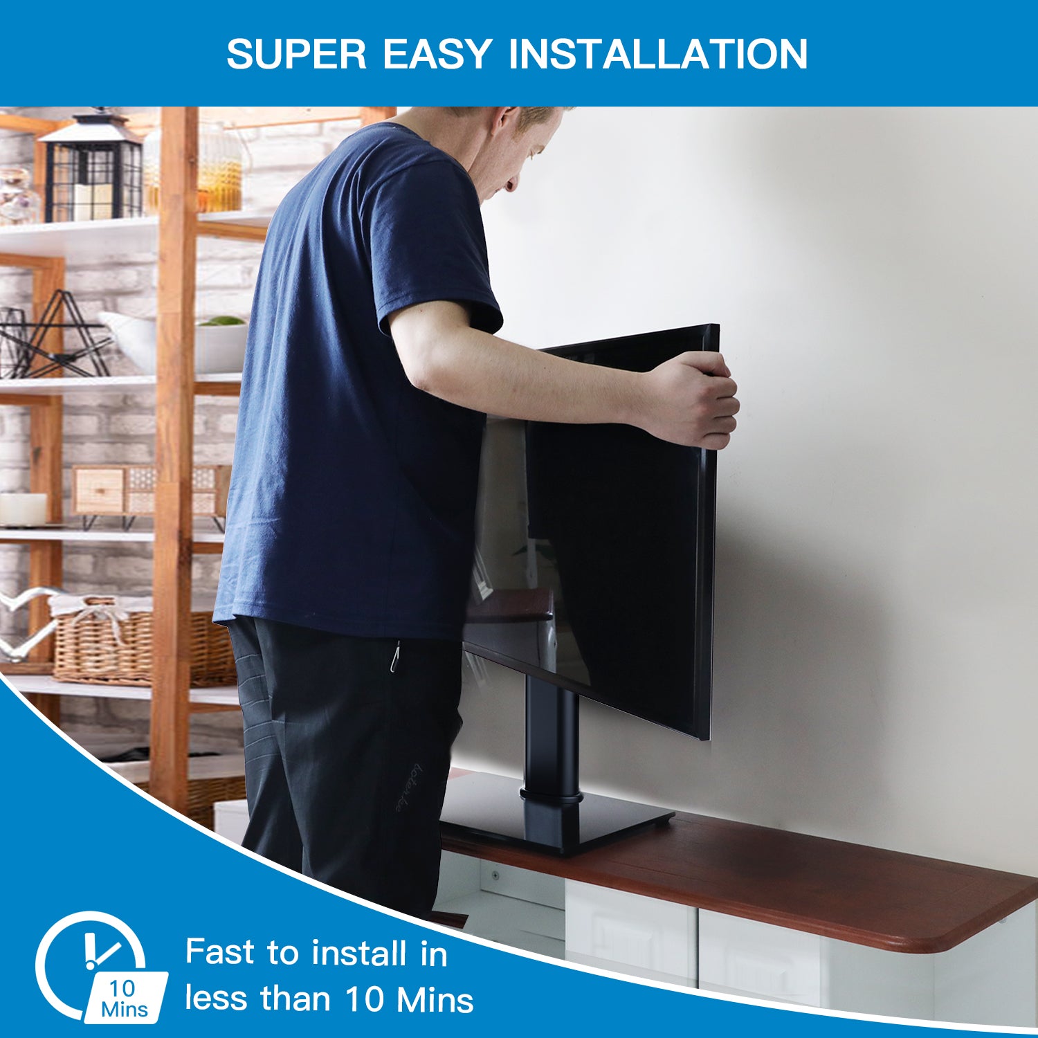 The swivel tabletop TV stand conveniently rotates ± 30° to meet a variety of different viewing needs and requirements. Choose the best viewing position from anywhere in the room. Offers 4 inches of height adjustment to suit different applications or TV sizes. Just follow our easy-to-use instruction manual. A tabletop TV stand will save you money on installation and avoid wall damage. Super easy to install and up and running in less than 10 minutes. Easily move anywhere, great for engineering, functionality, general orientation.