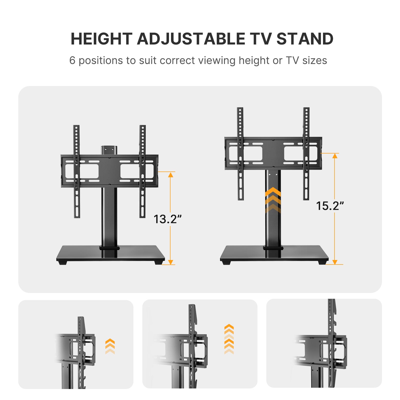 This swivel tabletop TV stands conveniently swivel TV ± 30° by hand to meet a variety of different viewing needs and requirements. Choose the best viewing position from anywhere in the room. Easy installation within 15 mins. Simply follow our easy-to-use instructional manual and videos. Comes with height adjustment ranging from 8 in to suit different applications or TV sizes. This tabletop TV stand will save your mounting fee and avoid wall damage. Super easy to install and have it up in running in less than 15 minutes. Move anywhere conveniently, perfect for engineering, function, and great directions.