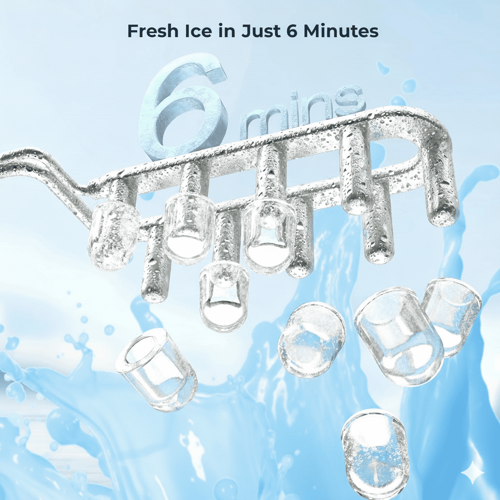 Fast Ice Production in Only 6 Minutes: This powerful ice maker delivers 9 fresh bullet-shaped ice cubes in as little as 6 minutes and can produce up to 26 lbs of ice in 24 hours. Perfect for family dinners, cocktail parties, BBQs.