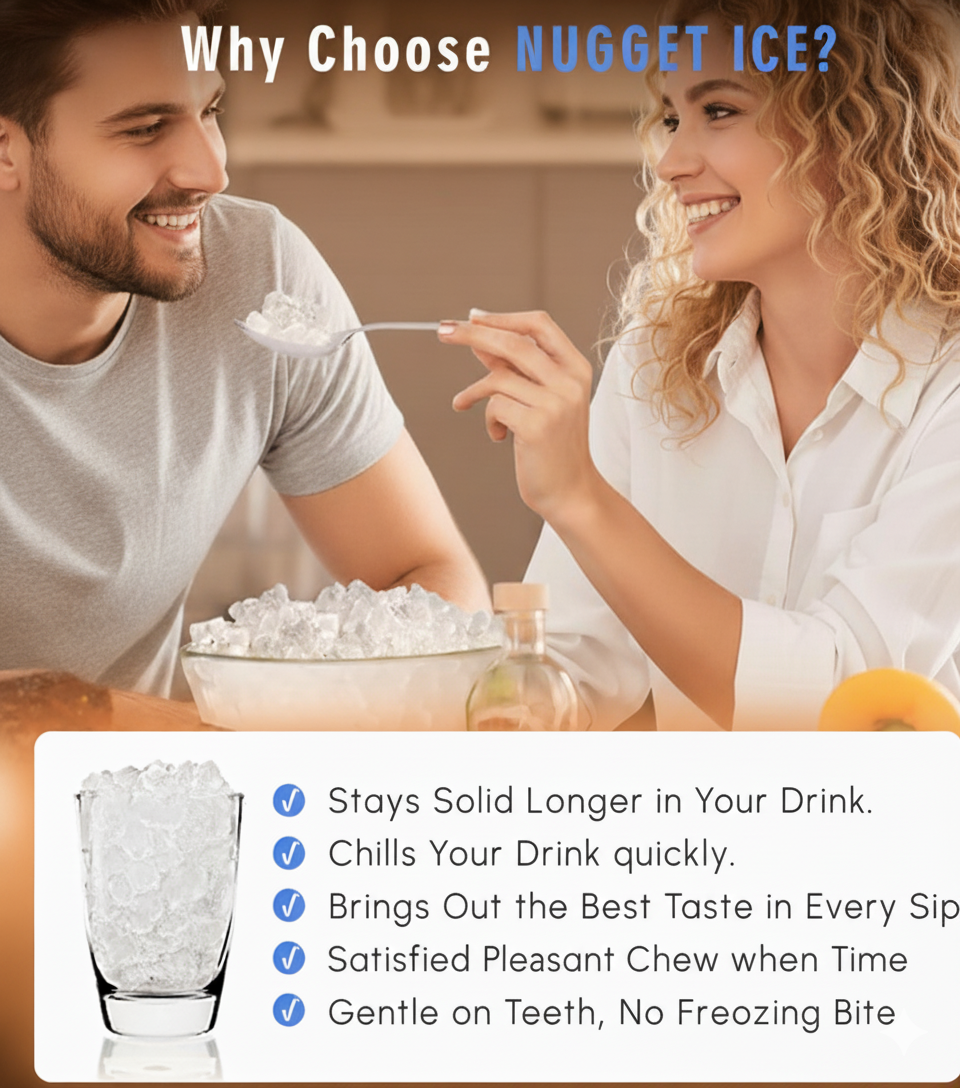Soft Chewable Nugget Ice: Unlike traditional hard cubes, nugget ice is soft, airy, and easy to chew. The larger surface area cools drinks quickly without diluting flavor, perfect for whiskey, cocktails, smoothies.