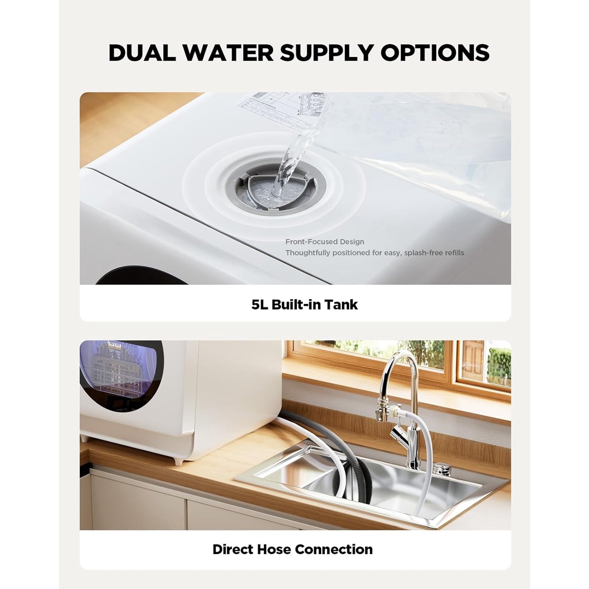 Enjoy the convenience of two water supply options: a kitchen sink faucet hookup with the included water hose (adapter may be required) or a built-in separate water tank, perfect for situations where faucet connections are unavailable or when you prefer washing dishes away from the sink.Extra-Drying Function for Clean, Fresh Dishes