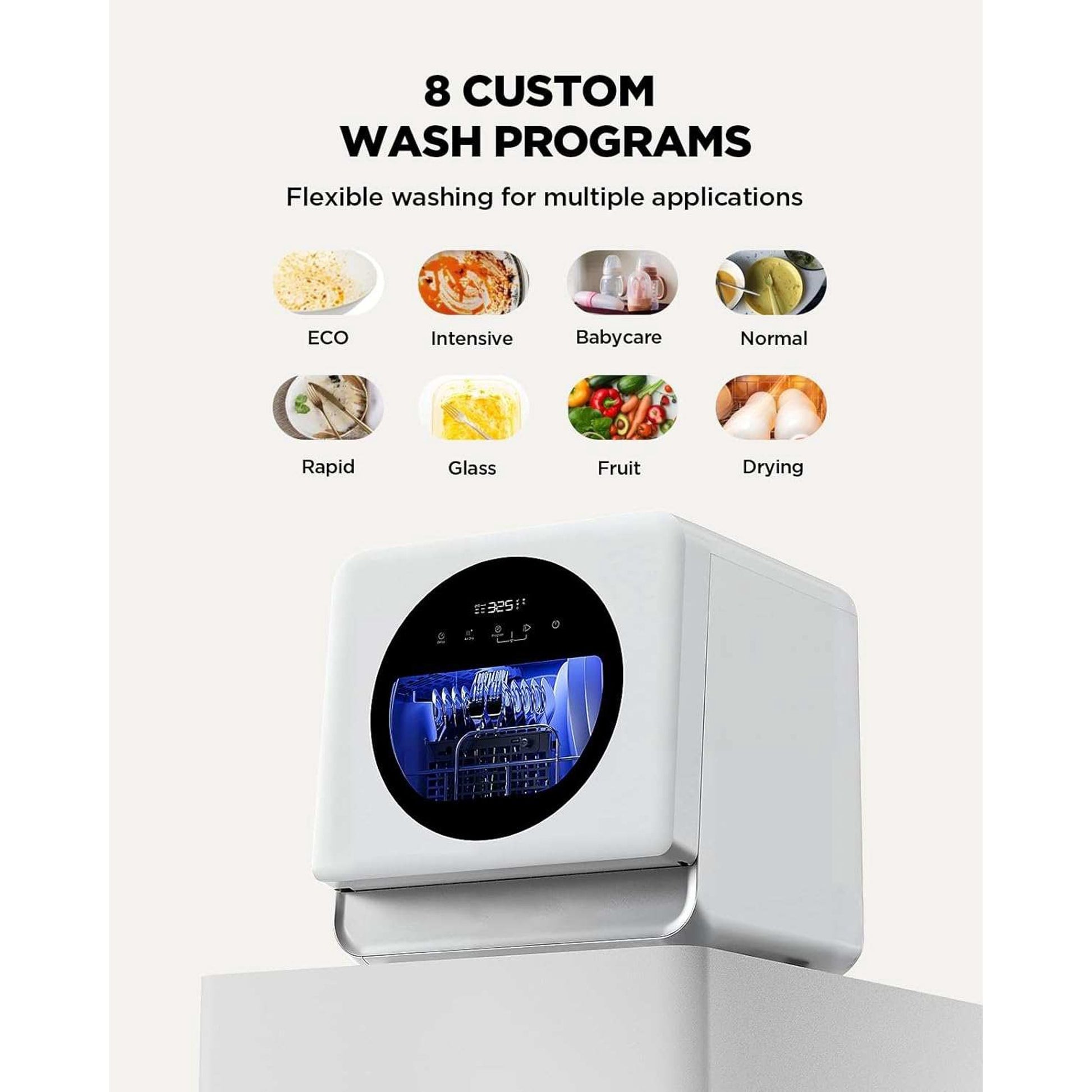 With the smart APP, this portable dishwasher countertop offers remote control to start, pause, or customize washing cycles. Choose from 6+2 versatile modes, including ECO, Intensive/Babycare, Normal, Rapid, Glass, Fruit Wash, and more. Whether it’s delicate glasses or heavily soiled dishes, this mini dishwasher has you covered.Large Capacity for Daily Needs