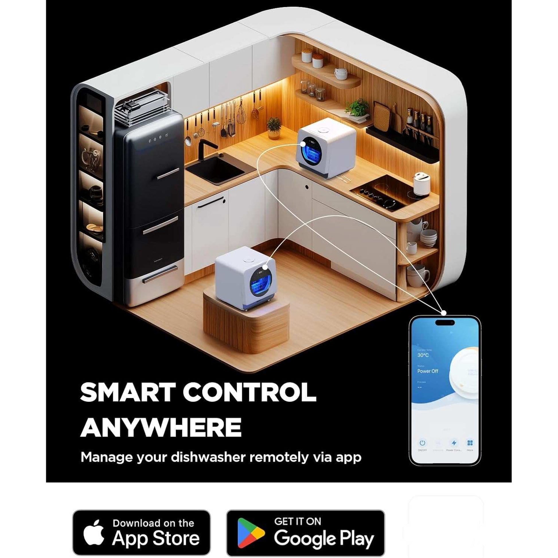 This countertop dishwasher measures 17.72" (Depth) x 18.11" (Height) x 16.93" (Width), weighing 28 lbs, and offers a low noise level of 50dB, making it an ideal choice for apartments, RVs, boats, or even a cabin in the woods. Its portable design lets you easily move it wherever you need it, whether at home or on the go.Smart APP Control & 6+2 Wash Programs