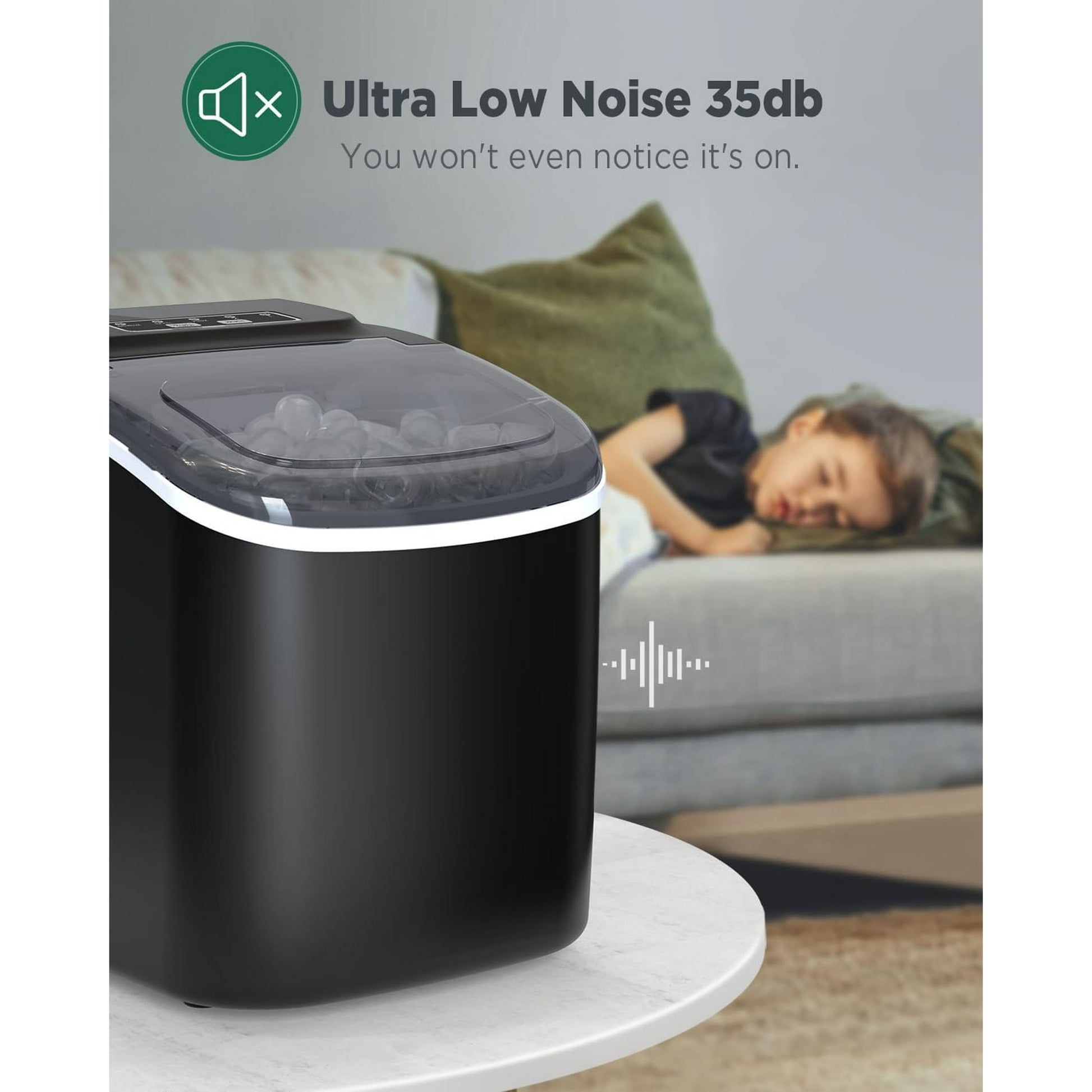 - Low-Noise Design: The Philergo ice machine has a soundproof design to ensure that the machine will not disturb your daily life when it is running. Its noise when making ice is less than 35 decibels, which runs as softly as a refrigerator. The transparent lid lets you check ice levels, and an automatic sensor stops production when the basket is full.