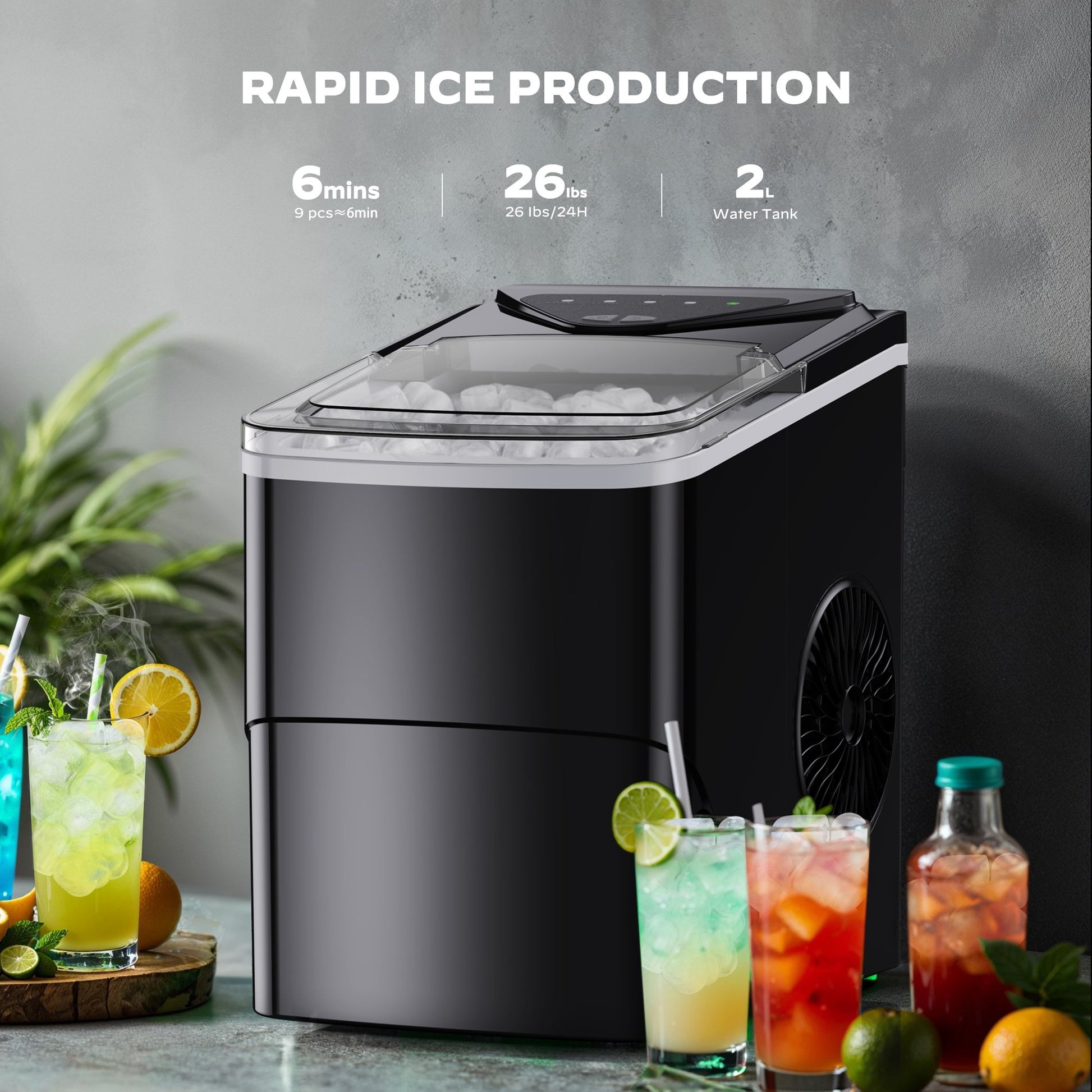 - 🧊Produce 9 ice cubes in just 6 minutes, with a daily capacity of up to 26 lbs to meet household demands. The 2L water tank reduces the hassle of frequent refills, ensuring a continuous supply of ice. With energy-efficient performance, these ice makers consume less than 0.1 kWh per hour on average, making them a cost-effective choice for everyday use.