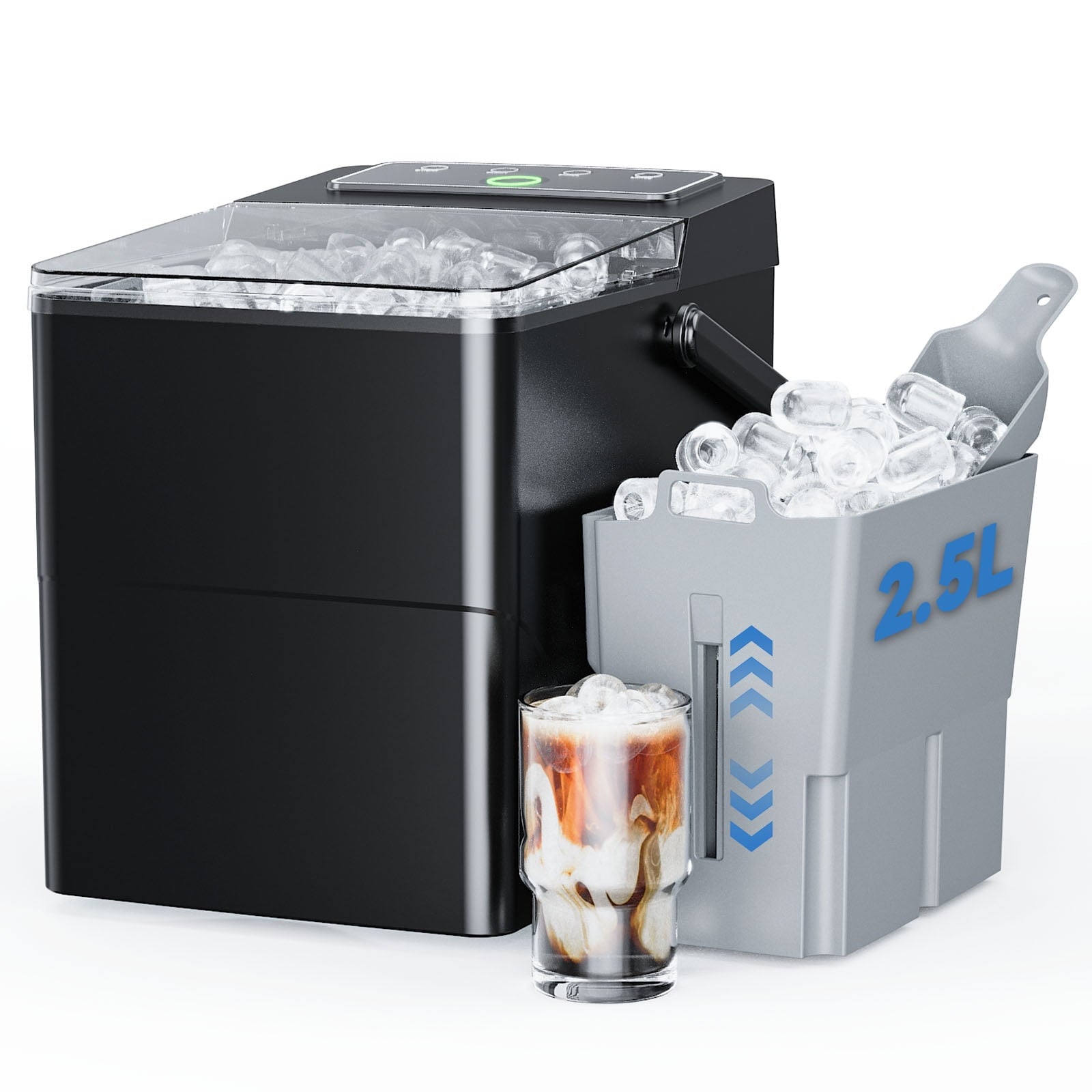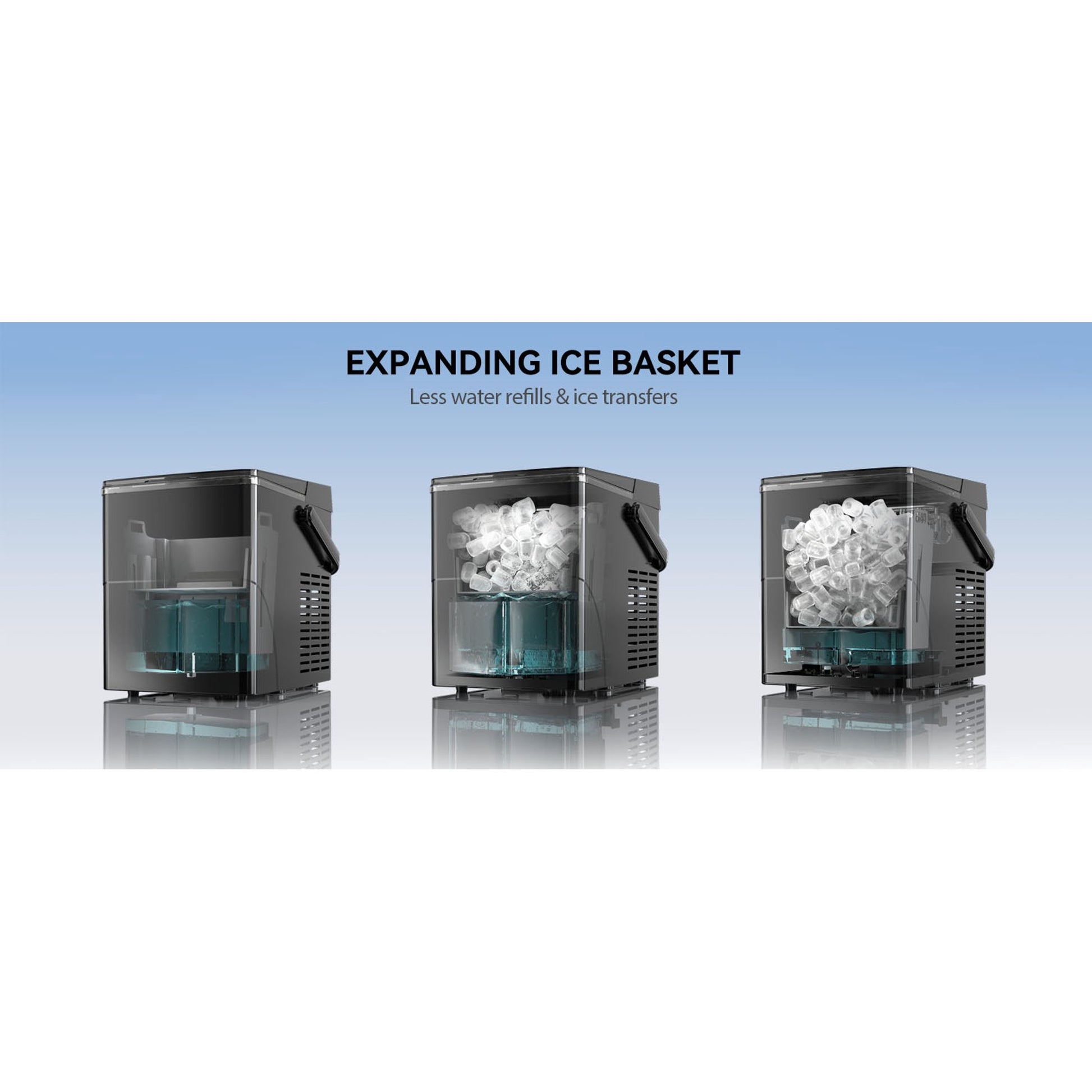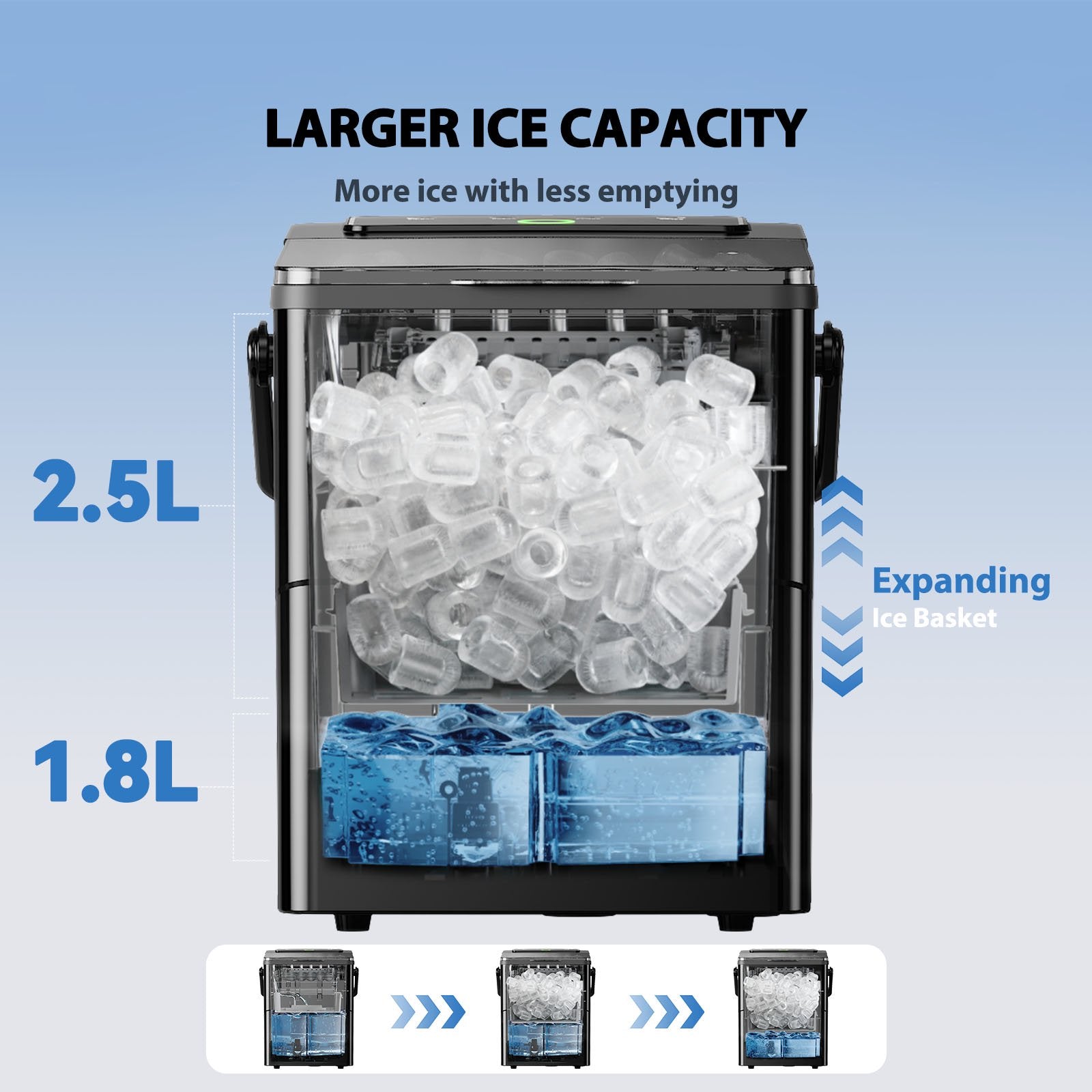 Expanding Ice Basket: Bringing fresh innovation to countertop ice maker. The larger 1.8L water tank and 2.5L ice basket reduce the need for water refills and ice transfers, ensuring a seamless supply of ice.