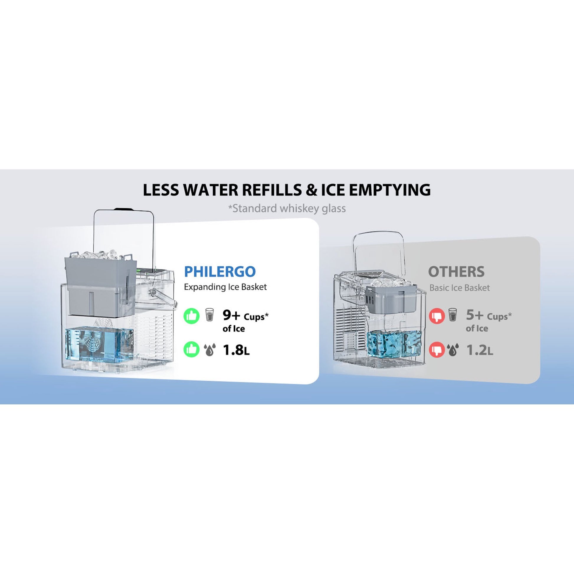 - 2025 Newest Innovation Ice Maker: Expanding Ice Basket, 2.5L Ice Basket, 1.8L Water Tank. Lager ice basket can store more bullet ice cubes, like our Philergo ice maker, one-time ice maker can fill at least 10 cups.